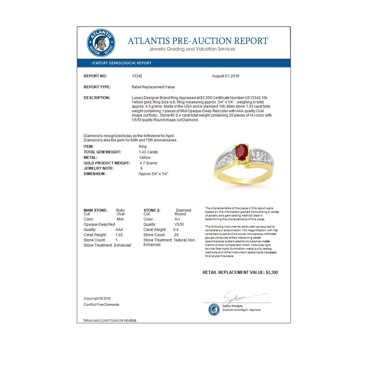 REF-46M4H -13342 ---- 1.43 CTW Ruby & Diamond Ring 10K Yellow Gold ---- Luxury Designer Brand Ring Appraised at $3,300 Certificate Number US13342 10k Yellow gold, Ring Size is 6, Ring measuring approx. 3/4" x 1/4" , weighing in total approx. 4.5 grams. Made in the USA and is stamped 10k, Main stone 1.03 carat total weight containing 1 pieces of Mid-Opaque-Deep Red color with AAA quality Oval shape cut Ruby , Stone #2 0.4 carat total weight containing 20 pieces of H-I color with VS/SI quality Round shape cut Diamond