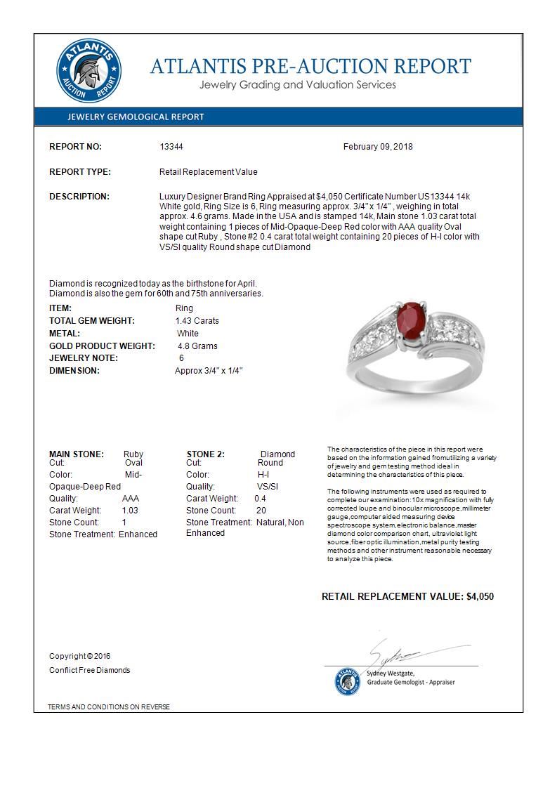 REF-56W8F -13344 ---- 1.43 CTW Ruby & Diamond Ring 14K White Gold ---- Luxury Designer Brand Ring Appraised at $4,050 Certificate Number US13344 14k White gold, Ring Size is 6, Ring measuring approx. 3/4" x 1/4" , weighing in total approx. 4.6 grams. Made in the USA and is stamped 14k, Main stone 1.03 carat total weight containing 1 pieces of Mid-Opaque-Deep Red color with AAA quality Oval shape cut Ruby , Stone #2 0.4 carat total weight containing 20 pieces of H-I color with VS/SI quality Round shape cut Diamond