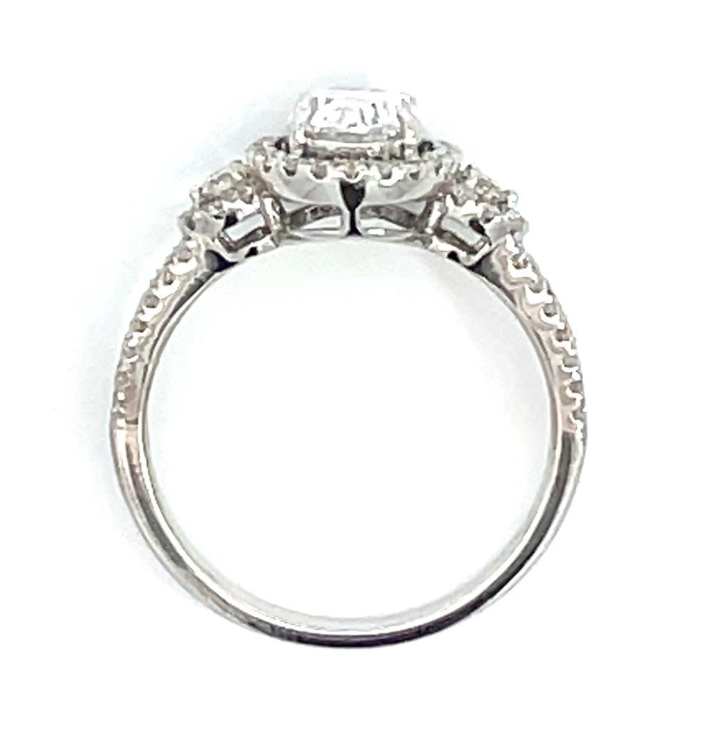 One electronically tested 14KT white gold lady's cast fashion oval halo wedding ring with a cathedral basket motif with a bright polish finish. The featured lady's ring has a shank measuring 1.70 millimeters wide. Identified with markings of "14K". Condition is new, good workmanship. Containing: One prong set oval shaped cut diamond, measuring 7.45 x 5.60 x 3.50mm (depth est.), 7.00% GTCF approximate weight of 1.00ct. Graded in the setting. Color G - H Clarity I-1 Cut Good Two prong set round brilliant cut diamonds, measuring 2.35 - 2.30 x 1.44mm (depth est.) approximate total weight of 2 Stones = 0.10ct. Graded in the setting. Color I - J Clarity SI-1 to SI-2 Cut Very Good Sixty-Four prong set round brilliant cut diamonds, measuring 1.20 - 1.10 x 0.69mm (depth est.) approximate total weight of 64 Stones = 0.33ct. Graded in the setting. Color H - I Clarity SI-1 to SI-2 Cut Very Good Total Weight of Diamonds 1.43ct. Total Weight of Wedding Ring 3.00gm