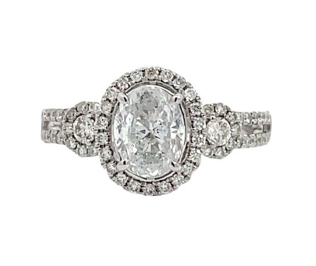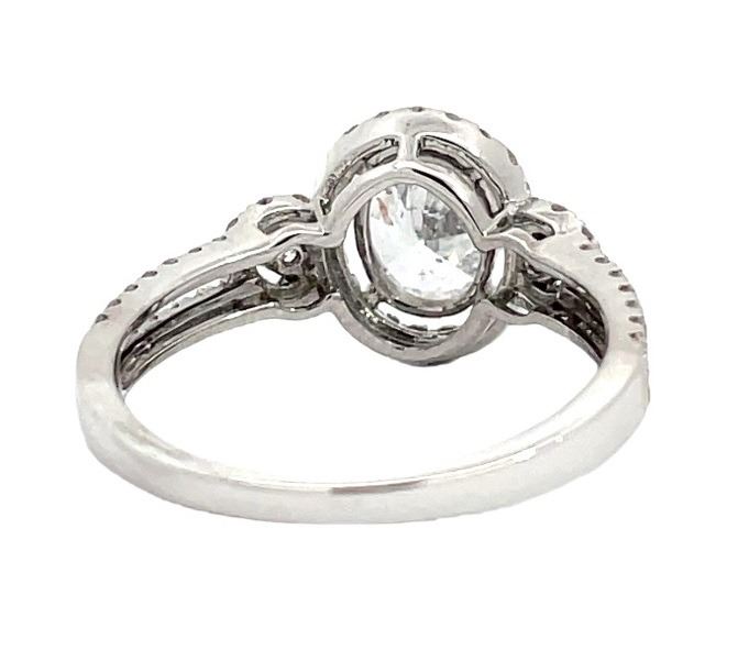 One electronically tested 14KT white gold lady's cast fashion oval halo wedding ring with a cathedral basket motif with a bright polish finish. The featured lady's ring has a shank measuring 1.70 millimeters wide. Identified with markings of "14K". Condition is new, good workmanship. Containing: One prong set oval shaped cut diamond, measuring 7.45 x 5.60 x 3.50mm (depth est.), 7.00% GTCF approximate weight of 1.00ct. Graded in the setting. Color G - H Clarity I-1 Cut Good Two prong set round brilliant cut diamonds, measuring 2.35 - 2.30 x 1.44mm (depth est.) approximate total weight of 2 Stones = 0.10ct. Graded in the setting. Color I - J Clarity SI-1 to SI-2 Cut Very Good Sixty-Four prong set round brilliant cut diamonds, measuring 1.20 - 1.10 x 0.69mm (depth est.) approximate total weight of 64 Stones = 0.33ct. Graded in the setting. Color H - I Clarity SI-1 to SI-2 Cut Very Good Total Weight of Diamonds 1.43ct. Total Weight of Wedding Ring 3.00gm