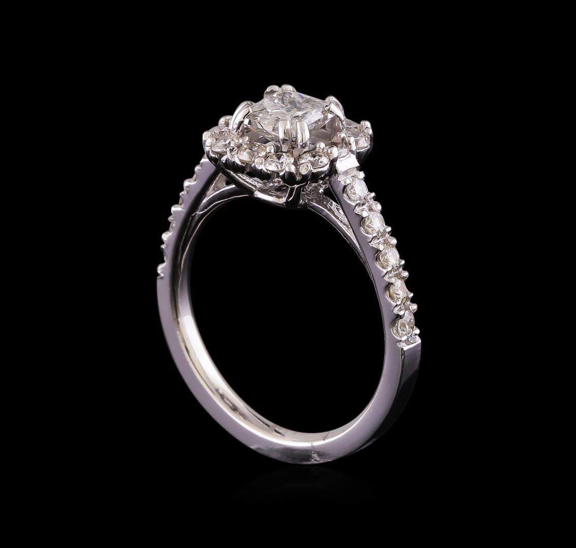 One electronically tested 14KT white gold lady's cast wedding ring with a cathedral halo with a bright polish finish. The featured lady's ring has a shank measuring 2.07 millimeters wide. Identified with markings of "14K". Condition is new, good workmanship. Containing: One prong set princess cut diamond, measuring 4.98 x 4.96 x 3.72mm (depth est.) approximate weight of 0.75ct. Graded in the setting. Clarity: I-2. Color: G - Good Twelve prong set round brilliant cut diamonds, measuring 2.10 - 2.00 x 1.27mm (depth est.) approximate total weight of 12 Stones = 0.40ct. Graded in the setting. Clarity: VS-2 to SI-1. Color: I - Good Ten prong set round brilliant cut diamonds, measuring 2.00 - 1.90 x 1.21mm (depth est.) approximate total weight of 10 Stones = 0.28ct. Graded in the setting. Clarity: SI-1 to SI-2. Color: I - Good. Total Weight of Diamonds 1.43ct. Total Weight of Ring 4.00gm. GAS Appraised at $4,885.00.