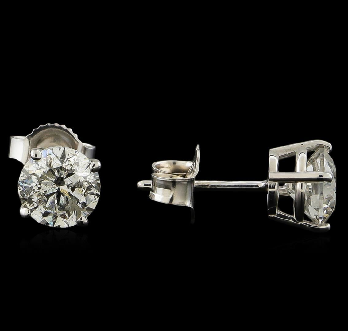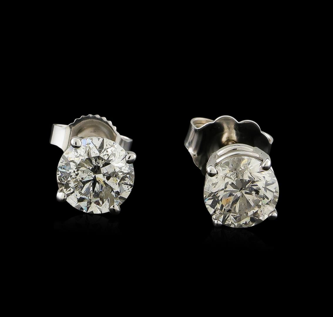 One pair electronically tested 14KT white gold cast & assembled diamond solitaire earrings with standard backs. Bright polish finish. Identified with markings of "14K". Condition is new, good workmanship. Containing: One prong set round brilliant cut diamond, measuring 5.40 - 5.35 x 3.60mm (depth est.) approximate weight of 0.69ct with a strong blue fluorescence. Graded in the setting. Clarity: I-2. Color: 66.9%. Table 57.6%. One prong set round brilliant cut diamond, measuring 5.55 - 5.50 x 3.60mm (depth est.) approximate weight of 0.74ct. Graded in the setting. Clarity: I-2. Color: 65.1%. Table 63.3%. Total Weight of Diamonds 1.43ct. Total Weight of Earrings 1.02gm. AIG Appraised at $6,335.00.