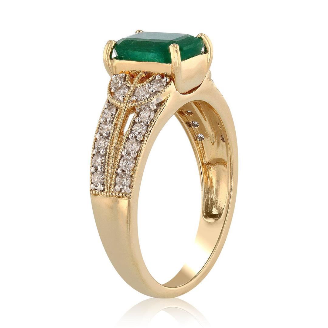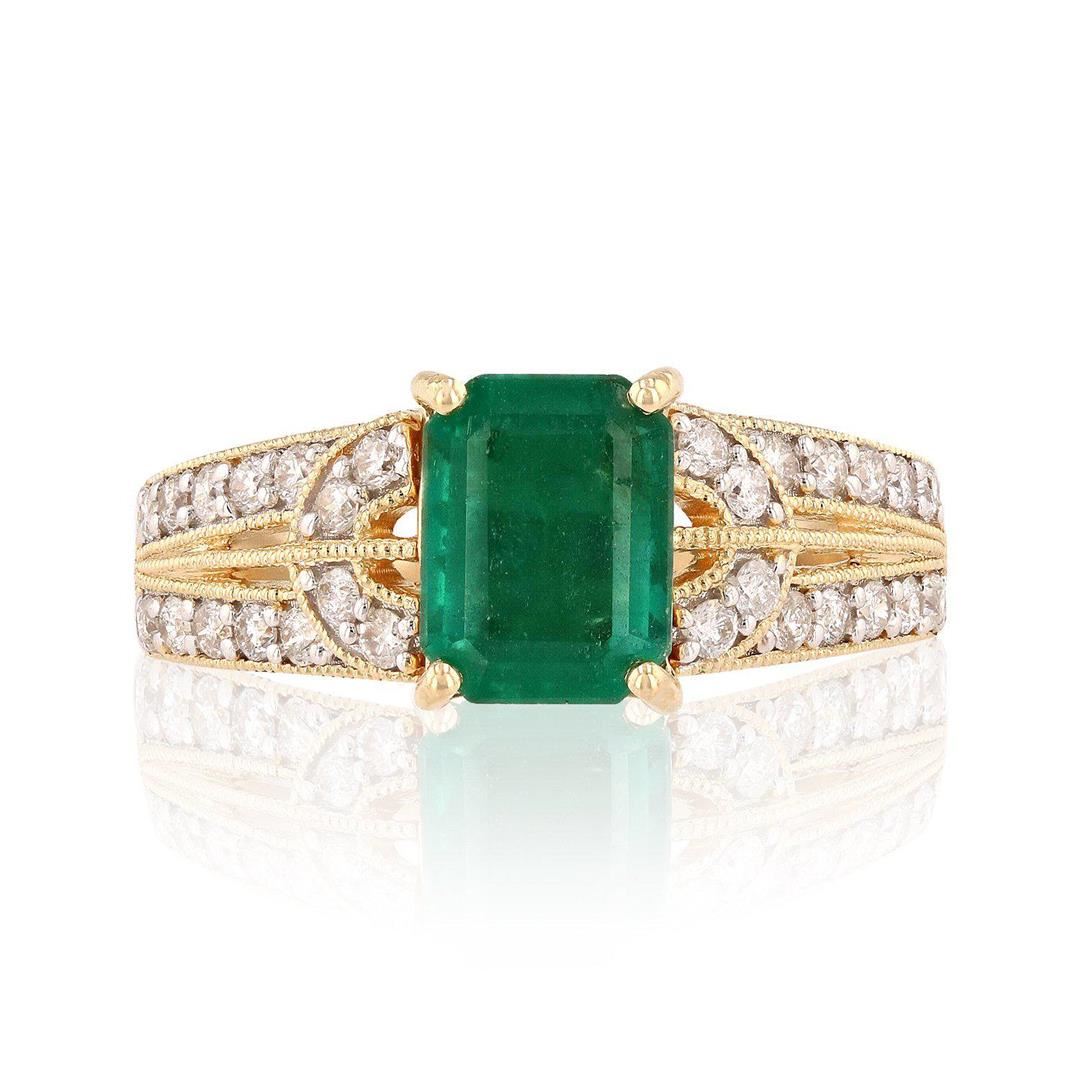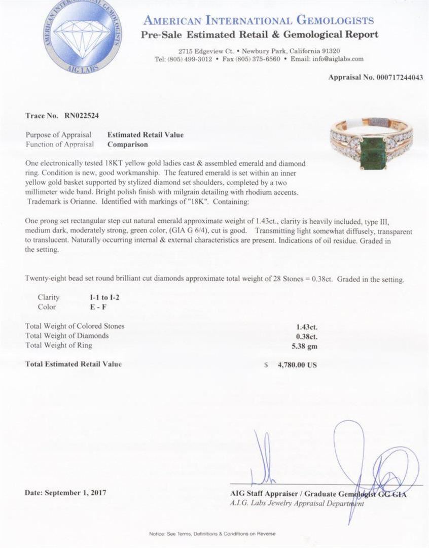 One electronically tested 18KT yellow gold ladies cast and assembled emerald and diamond ring. Condition is new, good workmanship. The featured emerald is set within an inner yellow gold basket supported by stylized diamond set shoulders, completed by a two millimeter wide band. Bright polish finish with milgrain detailing with rhodium accents. Trademark is Orianne. Identified with markings of "18K". Containing: One prong set rectangular step cut natural emerald approximate weight of 1.43ct., clarity is heavily included, type III, medium dark, moderately strong, green color, (GIA G 6/4), cut is good. Transmitting light somewhat diffusely, transparent to translucent. Naturally occurring internal & external characteristics are present. Indications of oil residue. Graded in the setting. Twenty-eight bead set round brilliant cut diamonds approximate total weight of 28 Stones = 0.38ctw. Graded in the setting. Clarity I-1 to I-2 Color E - F Total Weight of Colored Stones 1.43ct. Total Weight of Diamonds 0.38ctw. Total Weight of Ring 5.38 gm
