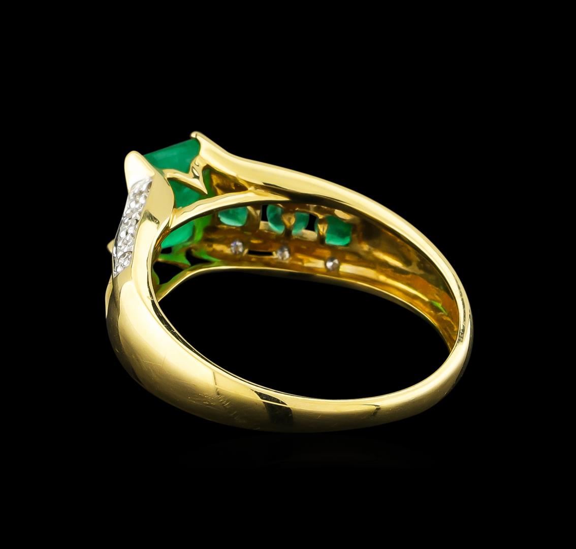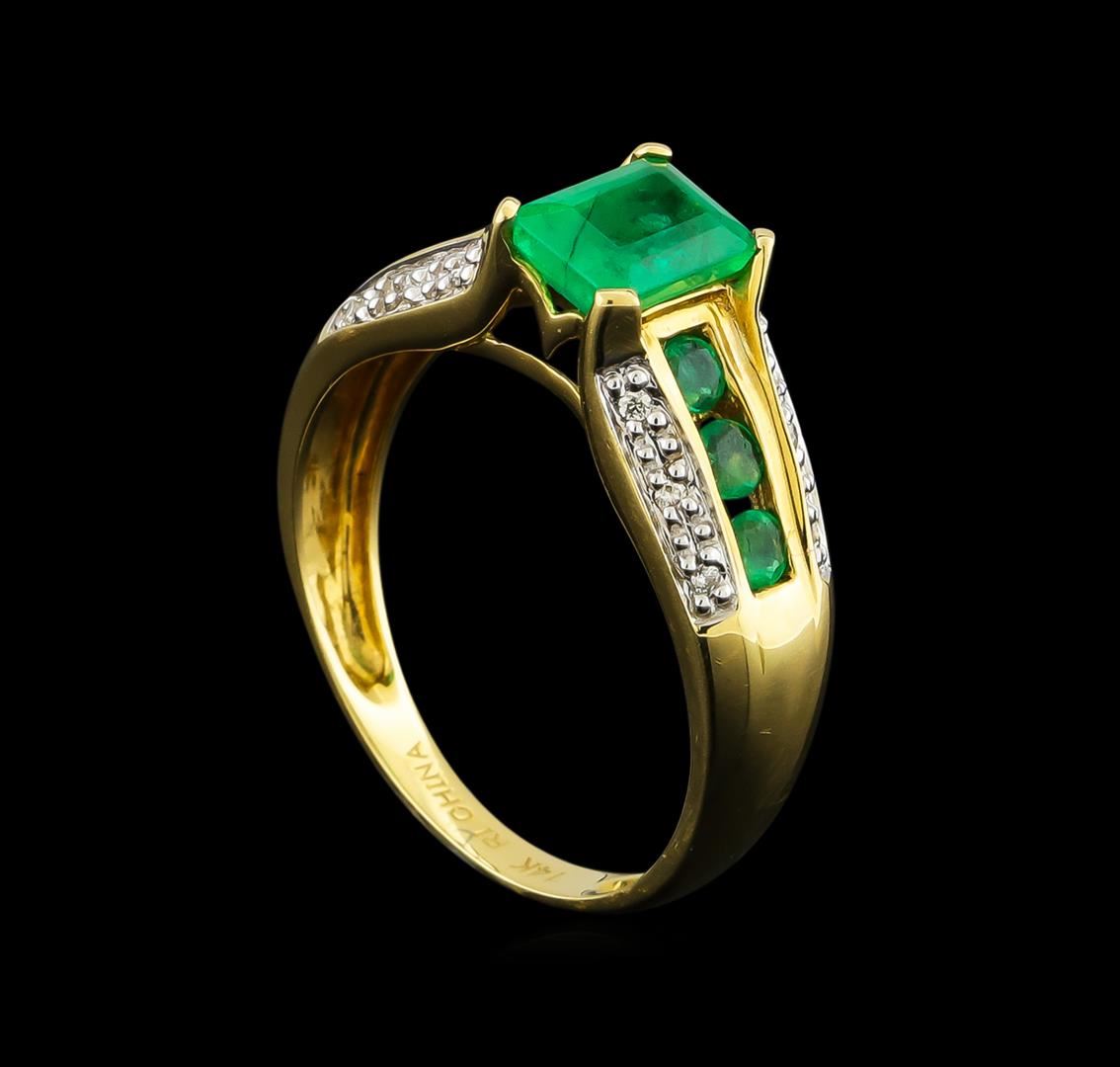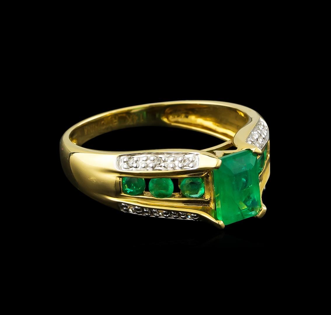 One ring featuring: 14KT yellow gold weighing 3.09 grams containing one emerald center stone with a total weight of 1.04ct, six emerald side stones with a total weight of 0.39ct, and 12 round diamonds.