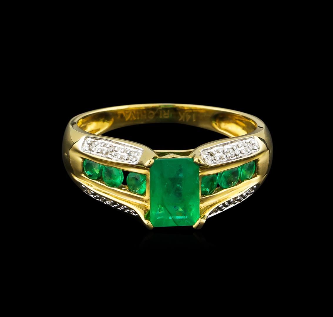 One ring featuring: 14KT yellow gold weighing 3.09 grams containing one emerald center stone with a total weight of 1.04ct, six emerald side stones with a total weight of 0.39ct, and 12 round diamonds.