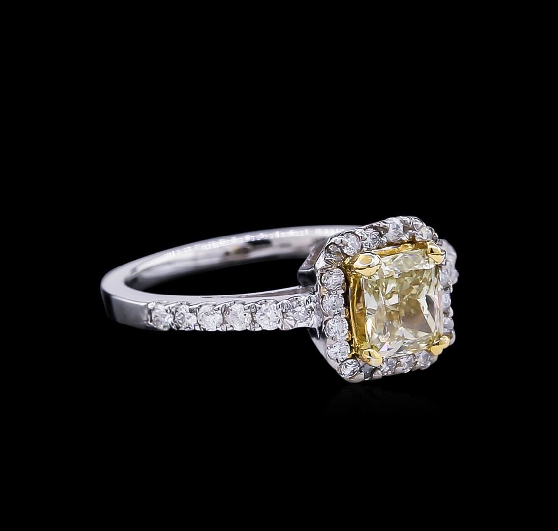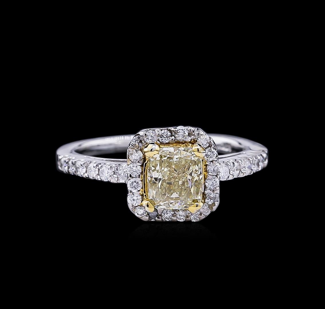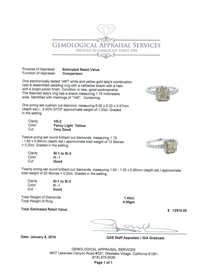 One electronically tested 14KT white and yellow gold lady's combination cast & assembled wedding ring with a cathedral shank with a halo with a bright polish finish. The featured lady's ring has a shank measuring 1.74 millimeters wide. Identified with markings of "14K". Condition is new, good workmanship. Containing: One prong set cushion cut diamond, measuring 6.02 x 5.30 x 3.57mm (depth est.) , 5.00.%. GTCF approximate weight of 1.03ct. Graded in the setting. Clarity: VS-2 Cut Very Good Twelve prong set round brilliant cut diamonds, measuring 1.70 - 1.60 x 0.99mm (depth est.) approximate total weight of 12 Stones = 0.20ct. Graded in the setting. Clarity: SI-1 to SI-2. Color: H - I. Cut Good Twenty prong set round brilliant cut diamonds, measuring 1.40 - 1.30 x 0.85mm (depth est.) approximate total weight of 20 Stones = 0.20ct. Graded in the setting. Clarity: SI-1 to SI-2. Color: H - I. Cut Good. Total Weight of Diamonds 1.43ct. Total Weight of Ring 4.00gm. GAS Appraised at $12,515.00.