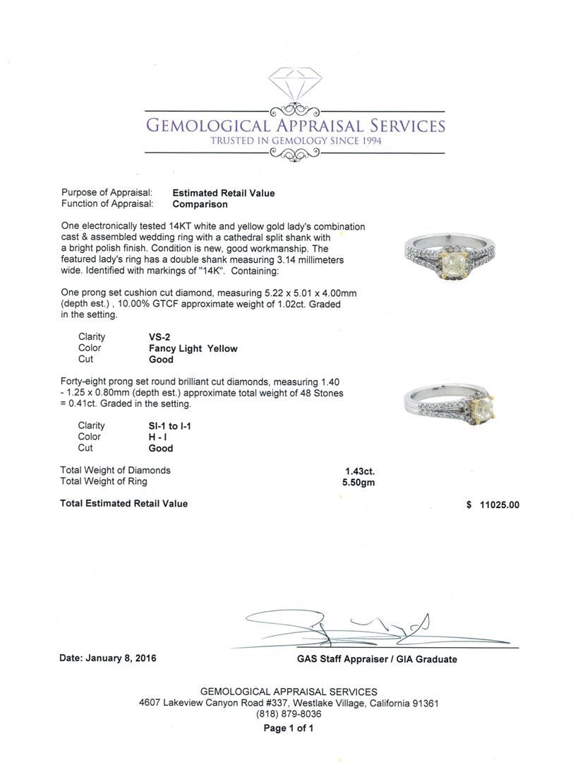 One electronically tested 14KT white and yellow gold lady's combination cast & assembled wedding ring with a cathedral split shank with a bright polish finish. The featured lady's ring has a double shank measuring 3.14 millimeters wide. Identified with markings of "14K". Condition is new, good workmanship. Containing: One prong set cushion cut diamond, measuring 5.22 x 5.01 x 4.00mm (depth est.) , 10.00.%. GTCF approximate weight of 1.02ct. Graded in the setting. Clarity: VS-2 Cut Good Forty-Eight prong set round brilliant cut diamonds, measuring 1.40 - 1.25 x 0.80mm (depth est.) approximate total weight of 48 Stones = 0.41ct. Graded in the setting. Clarity: SI-1 to I-1. Color: H - I. Cut Good. Total Weight of Diamonds 1.43ct. Total Weight of Ring 5.50gm. GAS Appraised at $11,025.00.