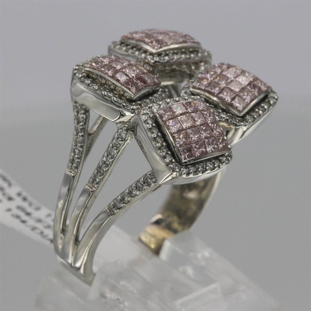 One lady's wedding ring featuring: 18KT white gold weighing 13.88 grams containing one center pink diamond weighing 1.43ct and 134 side diamonds weighing 0.61ctw. The pink diamond is color enhanced and princess cut with fine clarity and fancy pink color with excellent cut. The side diamonds are round cut, nautral unenhanced stones with SI1 clarity, G-H color and excellent cut. The ring is a size 8.25 but can be resized.