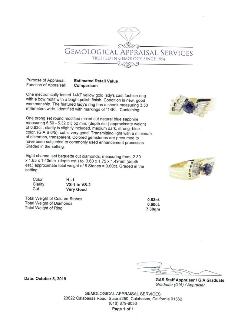 One electronically tested 14KT yellow gold lady's cast fashion ring with a bow motif with a bright polish finish. The featured lady's ring has a shank measuring 3.50 millimeters wide. Identified with markings of '14K'. Condition is new, good workmanship. Containing: One prong set round modified mixed cut natural blue sapphire, measuring 5.50 - 5.32 x 3.52 mm, (depth est.) approximate weight of 0.83ct., clarity is slightly included, medium dark, strong, blue color, (GIA B 6/5), cut is very good. Transmitting light with a minimum of distortion, transparent. Colored gemstones are presumed to have been subjected to commonly used enhancement processes. Graded in the setting. Eight channel set baguette cut diamonds, measuring from 2.80 x 1.65 x 1.40mm (depth est.) to 3.60 x 1.75 x 1.49mm (depth est.) approximate total weight of 8 Stones = 0.60ct. Graded in the setting. Color H - I Clarity VS-1 to VS-2 Cut Very Good. Total Weight of Colored Stones 0.83ct.. Total Weight of Diamonds 0.60ct.. Total Weight of Ring 7.30gm GAS Appraised at $4255.00. GAS Appraised.