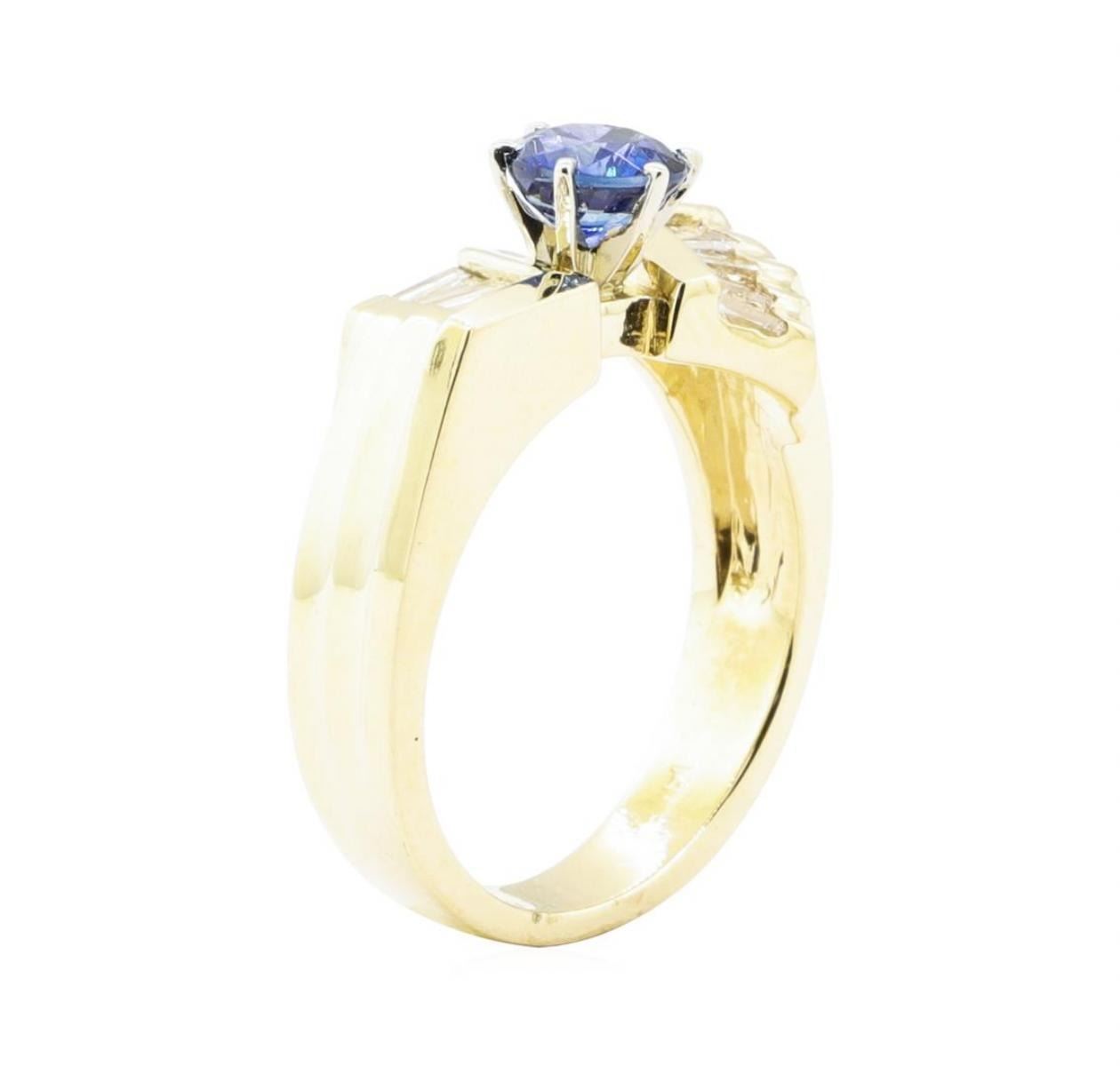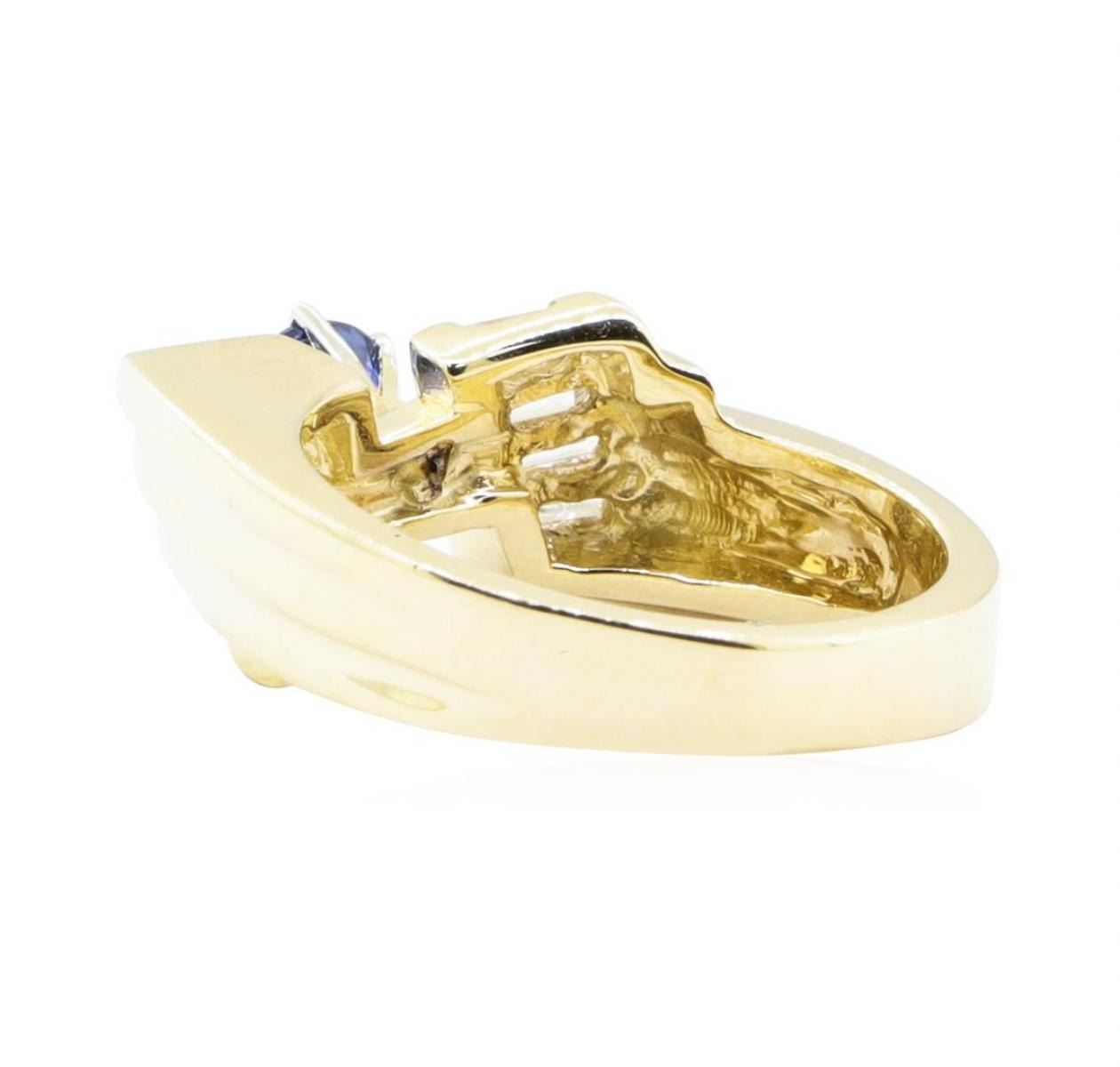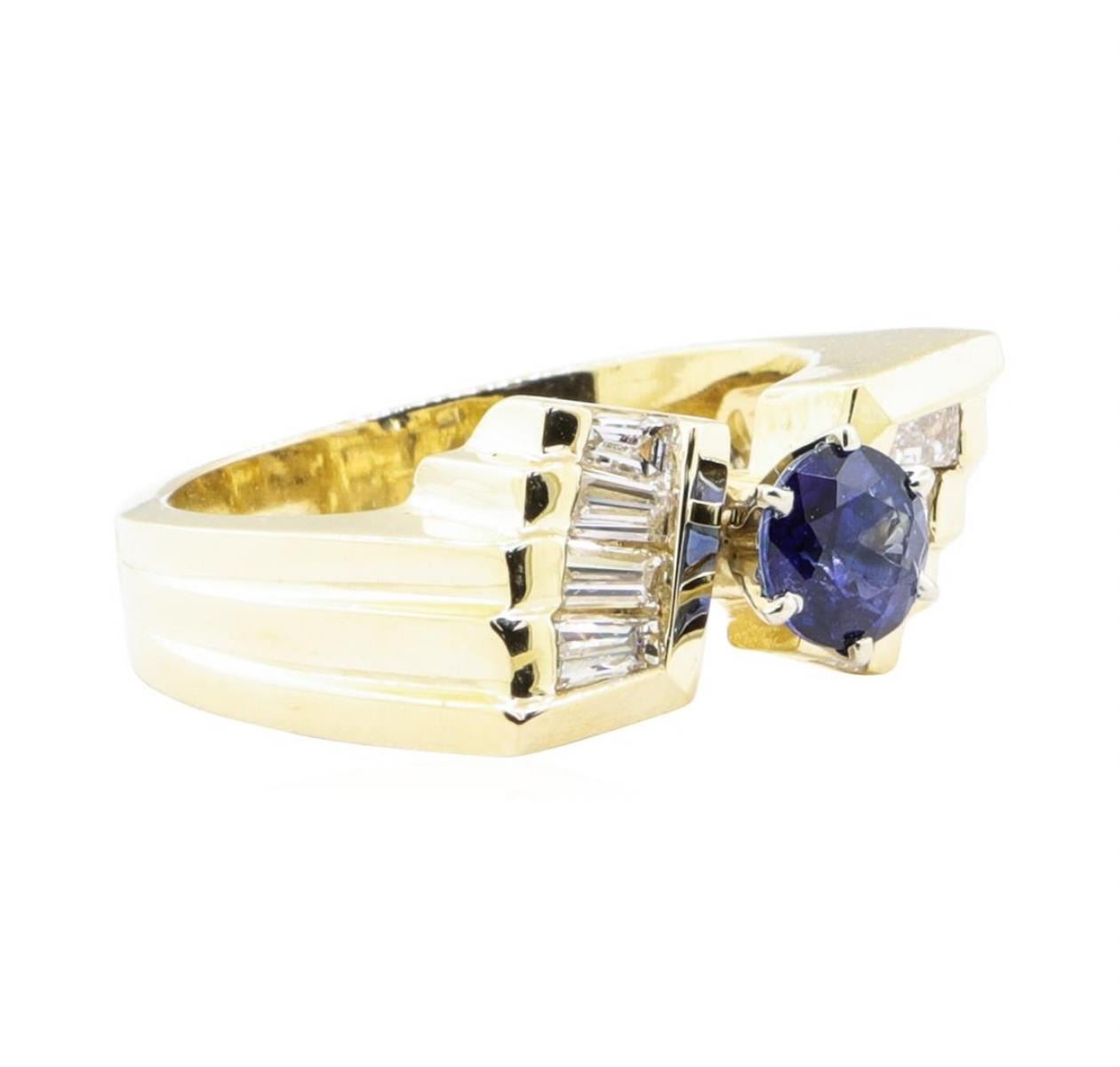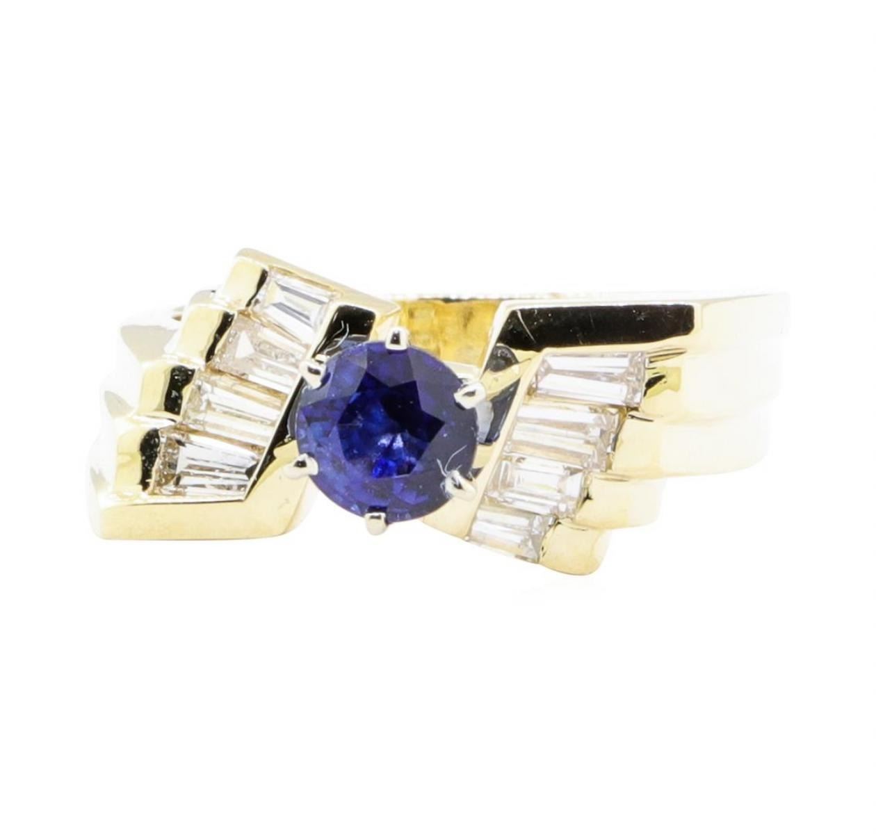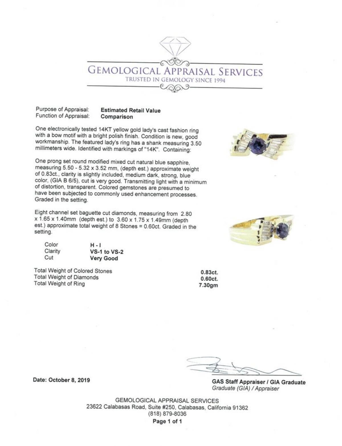 One electronically tested 14KT yellow gold lady's cast fashion ring with a bow motif with a bright polish finish. The featured lady's ring has a shank measuring 3.50 millimeters wide. Identified with markings of '14K'. Condition is new, good workmanship. Containing: One prong set round modified mixed cut natural blue sapphire, measuring 5.50 - 5.32 x 3.52 mm, (depth est.) approximate weight of 0.83ct., clarity is slightly included, medium dark, strong, blue color, (GIA B 6/5), cut is very good. Transmitting light with a minimum of distortion, transparent. Colored gemstones are presumed to have been subjected to commonly used enhancement processes. Graded in the setting. Eight channel set baguette cut diamonds, measuring from 2.80 x 1.65 x 1.40mm (depth est.) to 3.60 x 1.75 x 1.49mm (depth est.) approximate total weight of 8 Stones = 0.60 ct. Graded in the setting. Color H - I Clarity VS-1 to VS-2 Cut Very Good. Total Weight of Colored Stones 0.83ct.. Total Weight of Diamonds 0.60 ct.. Total Weight of Ring 7.30gm GAS Appraised at $4255.00. GAS Appraised.