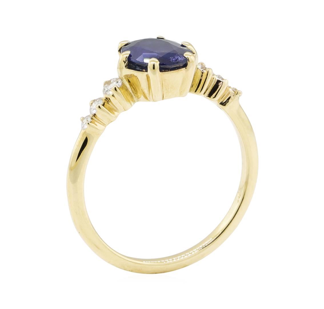 One ring featuring: 14KT yellow gold weighing 2.5 grams containing one oval sapphire weighing 1.18ct and diamonds weighing 0.25ctw.