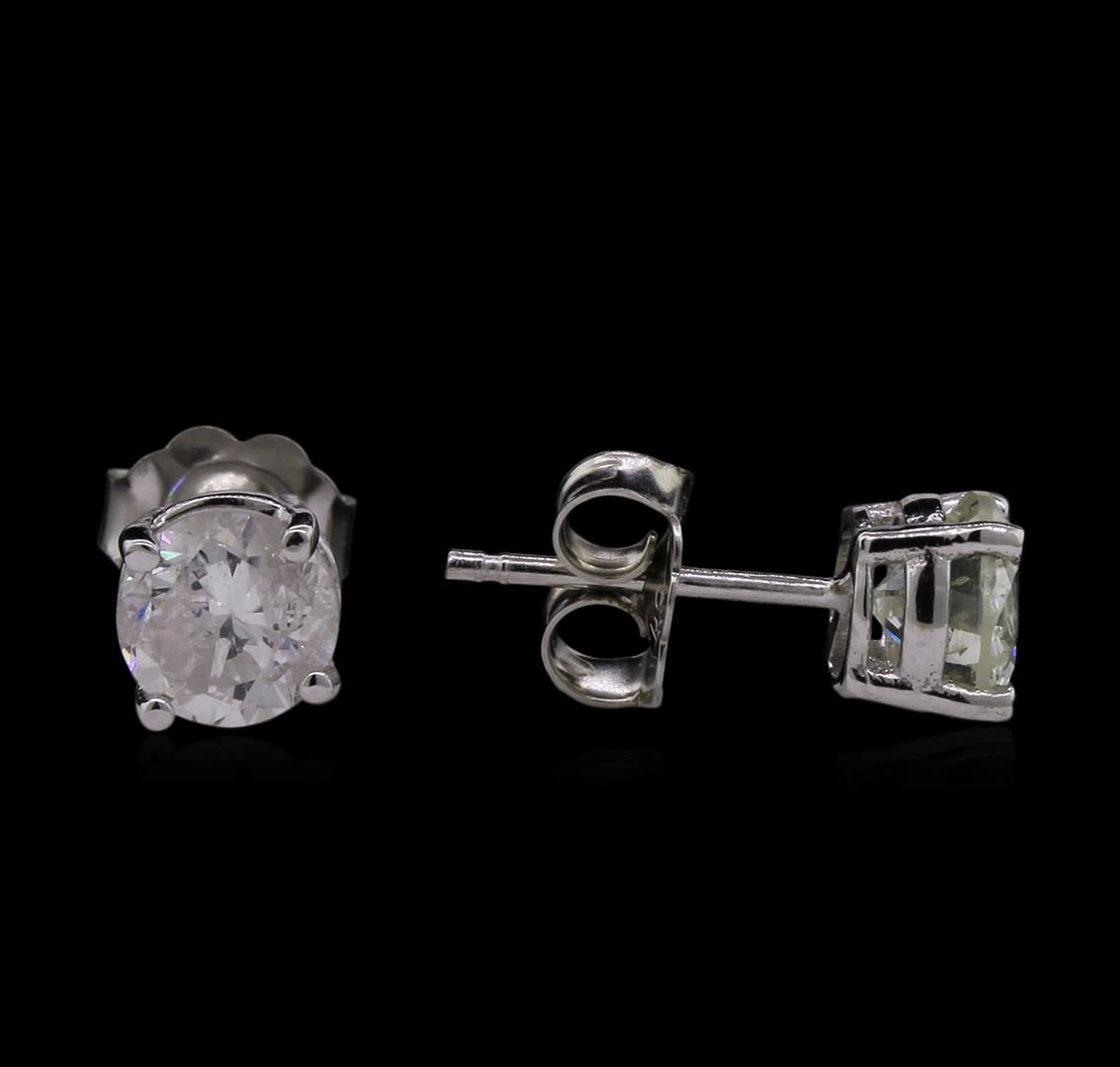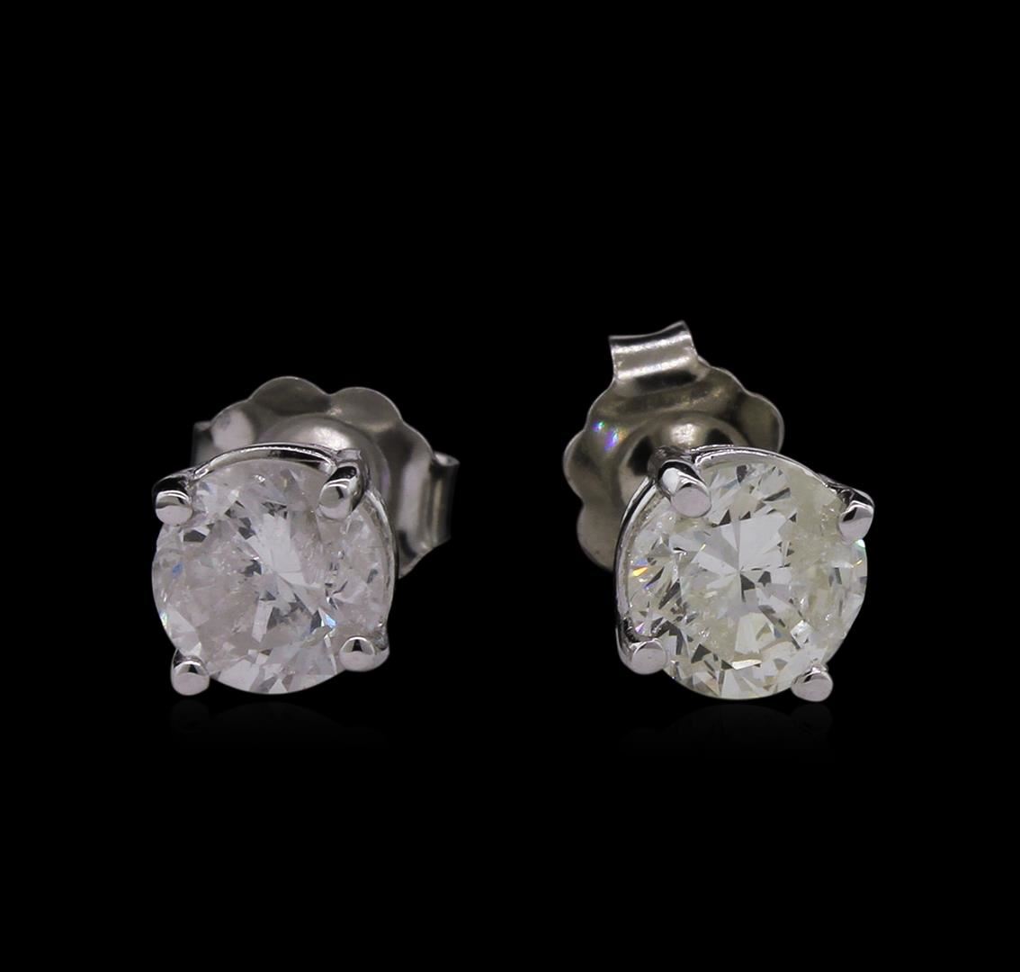 One pair electronically tested 14KT white gold cast & assembled diamond solitaire earrings with standard backs. Bright polish finish. Identified with markings of "14K". Condition is new, good workmanship. Containing: One prong set round brilliant cut diamond, measuring 5.35 - 5.34 x 3.60mm (depth est.), 8.00.%. GTCF approximate weight of 0.70ct with a faint yellow fluorescence. Graded in the setting. Clarity: I-2. Color: I. Depth 67.3%. Table 57.9%. One prong set round brilliant cut diamond, measuring 5.50 - 5.48 x 3.60mm (depth est.), 6.00.%. GTCF approximate weight of 0.73ct with a strong blue fluorescence. Graded in the setting. Clarity: I-2. Color: J. Depth 65.6%. Table 64.7%. Total Weight of Diamonds 1.43ct. Total Weight of Earrings 1.15gm. AIG Appraised at $5,185.00.