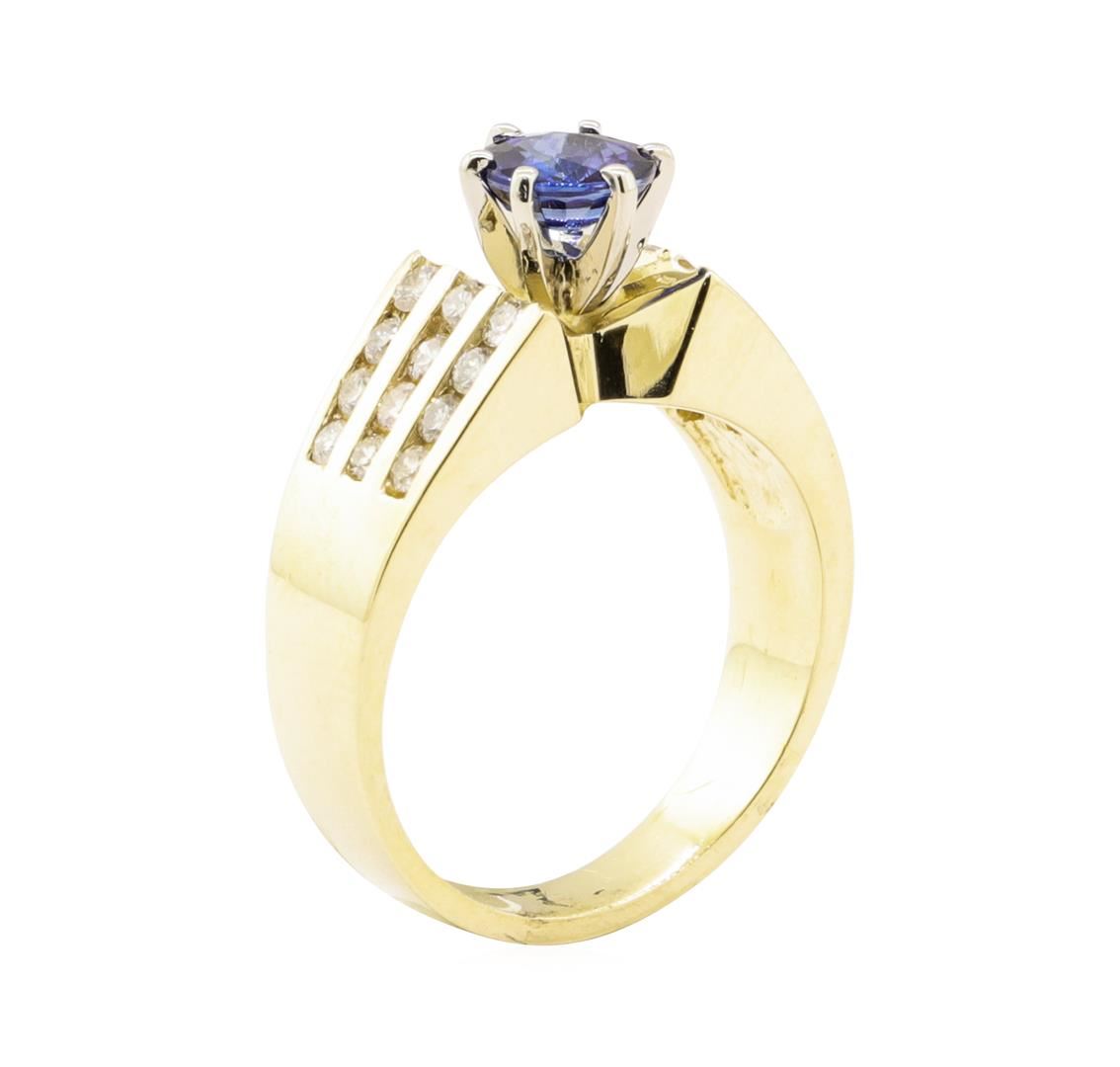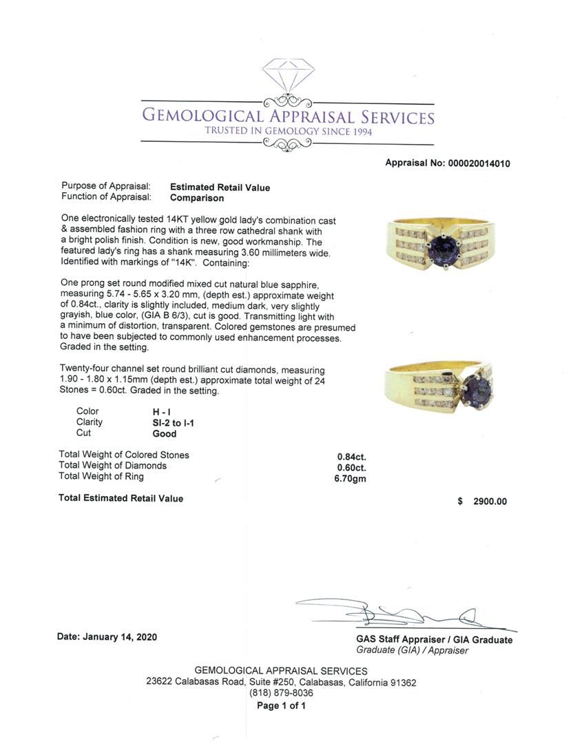 One electronically tested 14KT yellow gold lady's combination cast & assembled fashion ring with a three row cathedral shank with a bright polish finish. The featured lady's ring has a shank measuring 3.60 millimeters wide. Identified with markings of '14K'. Condition is new, good workmanship. Containing: One prong set round modified mixed cut natural blue sapphire, measuring 5.74 - 5.65 x 3.20 mm, (depth est.) approximate weight of 0.84ct., clarity is slightly included, medium dark, very slightly grayish, blue color, (GIA B 6/3), cut is good. Transmitting light with a minimum of distortion, transparent. Colored gemstones are presumed to have been subjected to commonly used enhancement processes. Graded in the setting. Twenty-Four channel set round brilliant cut diamonds, measuring 1.90 - 1.80 x 1.15mm (depth est.) approximate total weight of 24 Stones = 0.60 ct. Graded in the setting. Color H - I Clarity SI-2 to I-1 Cut Good. Total Weight of Colored Stones 0.84ct.. Total Weight of Diamonds 0.60 ct.. Total Weight of Ring 6.70gm GAS Appraised at  $2900.00. GAS Appraised.