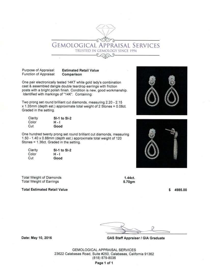 One pair electronically tested 14KT white gold lady's combination cast & assembled dangle double teardrop earrings with friction posts with a bright polish finish. Identified with markings of "14K". Condition is new, good workmanship. Containing: Two prong set round brilliant cut diamonds, measuring 2.20 - 2.15 x 1.35mm (depth est.) approximate total weight of 2 Stones = 0.08ct. Graded in the setting. Clarity: SI-1 to SI-2. Color: H - I. Cut Good One Hundred Twenty prong set round brilliant cut diamonds, measuring 1.50 - 1.40 x 0.88mm (depth est.) approximate total weight of 120 Stones = 1.36ct. Graded in the setting. Clarity: SI-1 to SI-2. Color: H - I. Cut Good. Total Weight of Diamonds 1.44ct. Total Weight of Earrings 5.70gm. GAS Appraised at $4,985.00.