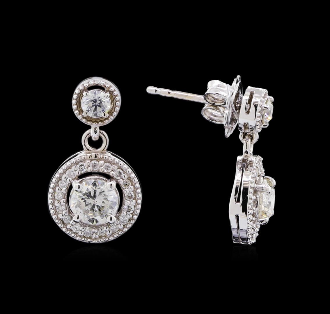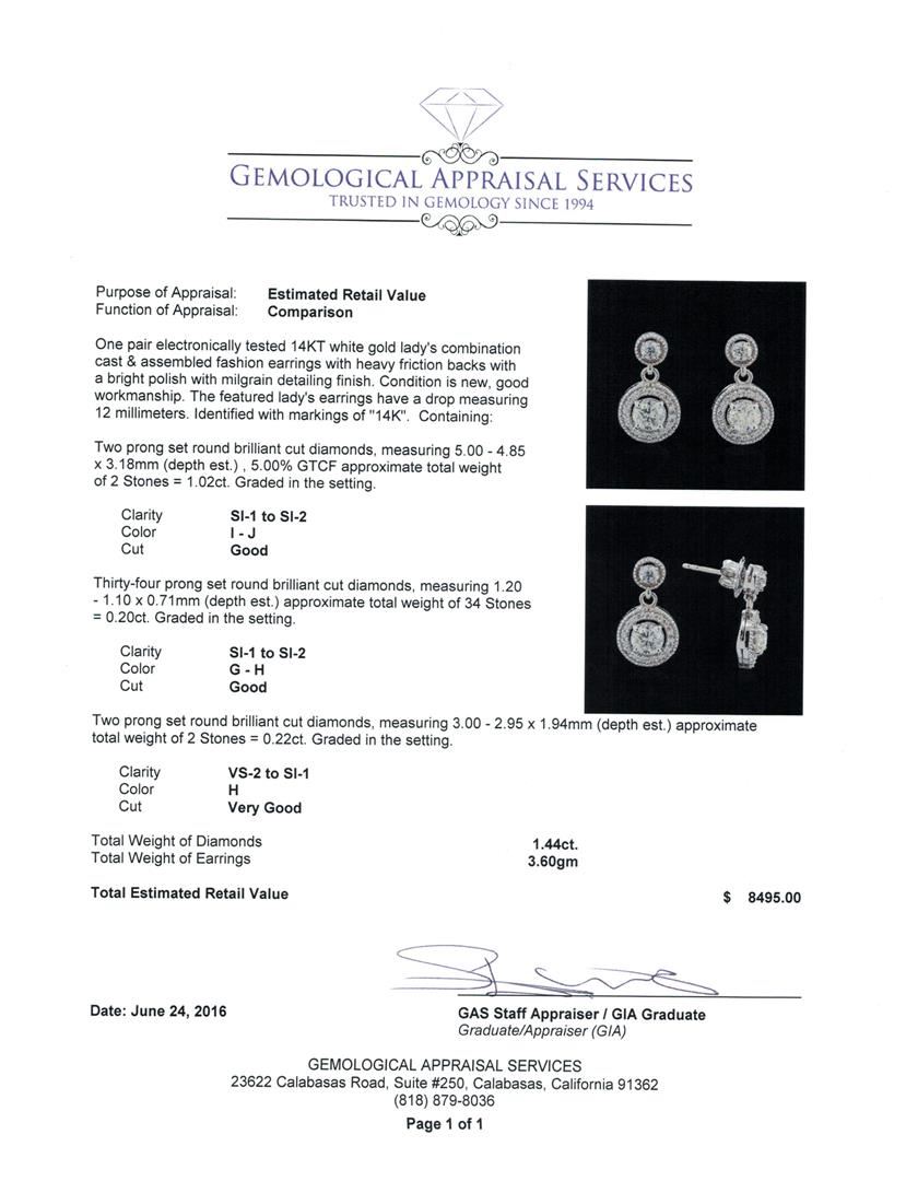 One pair electronically tested 14KT white gold lady's combination cast & assembled fashion earrings with heavy friction backs with a bright polish with milgrain detailing finish. The featured lady's earrings have a drop measuring 12 millimeters. Identified with markings of "14K". Condition is new, good workmanship. Containing: Two prong set round brilliant cut diamonds, measuring 5.00 - 4.85 x 3.18mm (depth est.) , 5.00.%. GTCF approximate total weight of 2 Stones = 1.02ct. Graded in the setting. Clarity: SI-1 to SI-2. Color: I - J. Cut Good Thirty-Four prong set round brilliant cut diamonds, measuring 1.20 - 1.10 x 0.71mm (depth est.) approximate total weight of 34 Stones = 0.20ct. Graded in the setting. Clarity: SI-1 to SI-2. Color: G - Good Two prong set round brilliant cut diamonds, measuring 3.00 - 2.95 x 1.94mm (depth est.) approximate total weight of 2 Stones = 0.22ct. Graded in the setting. Clarity: VS-2 to SI-1. Color: Very Good. Total Weight of Diamonds 1.44ct. Total Weight of Earrings 3.60gm. GAS Appraised at $8,495.00.