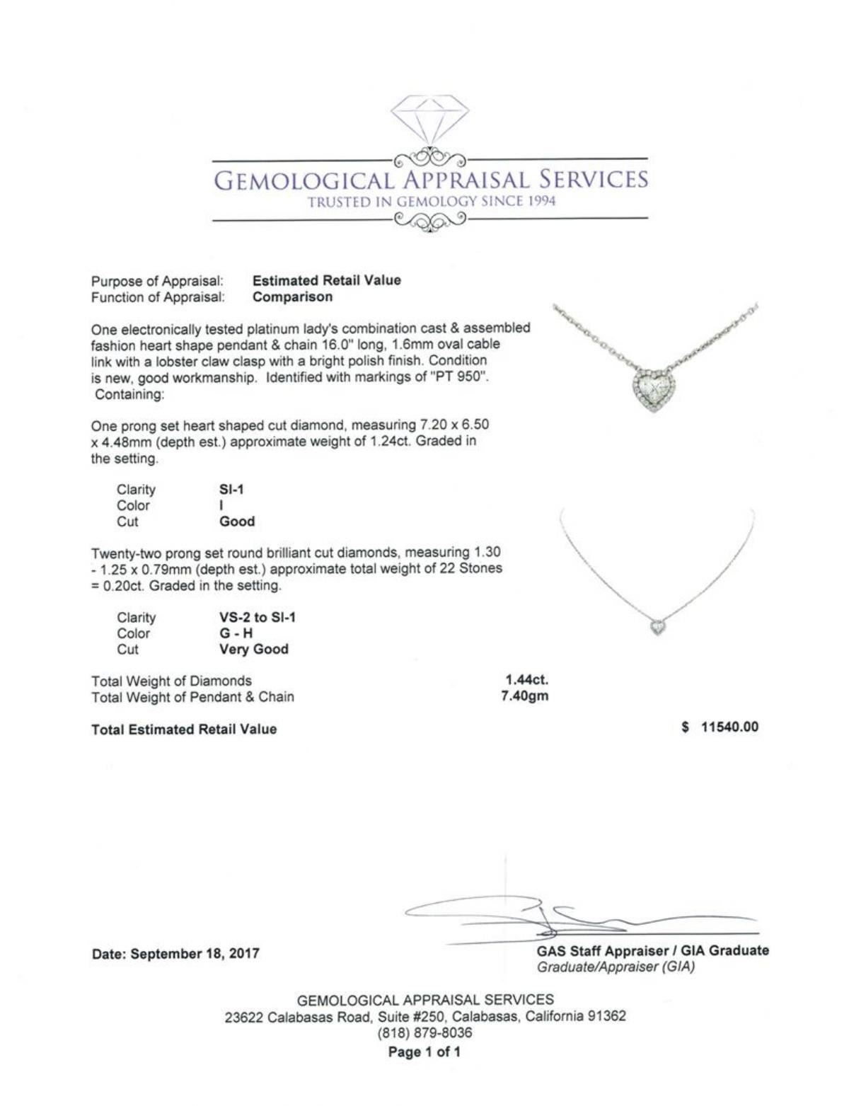 One electronically tested platinum lady's combination cast & assembled fashion heart shape pendant & chain 16.0' long, 1.6mm oval cable link with a lobster claw clasp with a bright polish finish. Identified with markings of 'PT 950'. Condition is new, good workmanship. Containing: One prong set heart shaped cut diamond, measuring 7.20 x 6.50 x 4.48mm (depth est.) approximate weight of 1.24ct. Graded in the setting. Color I Clarity SI-1 Cut Good Twenty-Two prong set round brilliant cut diamonds, measuring 1.30 - 1.25 x 0.79mm (depth est.) approximate total weight of 22 Stones = 0.20ct. Graded in the setting. Color G - H Clarity VS-2 to SI-1 Cut Very Good. Total Weight of Diamonds 1.44ct.. Total Weight of Pendant & Chain 7.40gm GAS Appraised at $11540.00. GAS Appraised.