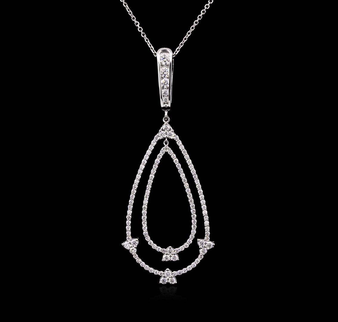 One electronically tested 14KT white gold lady's combination cast & assembled fashion pendant & chain 18.0" long, 1mm diamond cut cable link with a spring ring clasp with a bright polish finish. Identified with markings of "14K". Condition is new, good workmanship. Containing: Three channel set round brilliant cut diamonds, measuring 3.20 - 2.60 x 1.77mm (depth est.) approximate total weight of 3 Stones = 0.28ct. Graded in the setting. Clarity: SI-1 to SI-2. Color: H - I. Cut Very Good Seventeen prong set round brilliant cut diamonds, measuring 1.90 - 1.70 x 1.08mm (depth est.) approximate total weight of 17 Stones = 0.36ct. Graded in the setting. Clarity: SI-2 to I-1. Color: H - J. Cut Good One Hundred One prong set round brilliant cut diamonds, measuring 1.30 - 1.25 x 0.79mm (depth est.) approximate total weight of 101 Stones = 0.80ct. Graded in the setting. Clarity: SI-1 to I-1. Color: H - Good. Total Weight of Diamonds 1.44ct. Total Weight of Pendant & Chain 6.70gm. GAS Appraised.