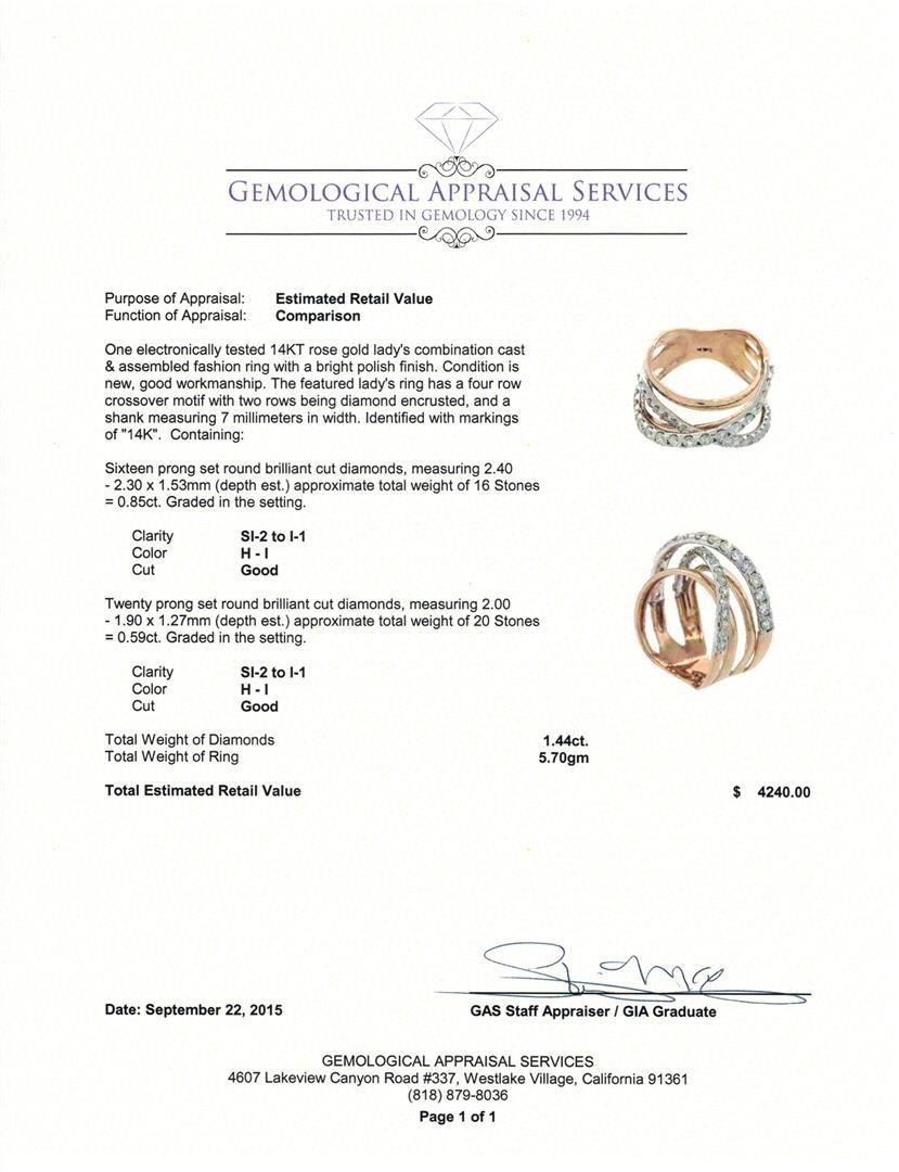 One electronically tested 14KT rose gold lady's combination cast & assembled fashion ring with a bright polish finish. The featured lady's ring has a four row crossover motif with two rows being diamond encrusted, and a shank measuring 7 millimeters in width. Identified with markings of "14K". Condition is new, good workmanship. Containing: Sixteen prong set round brilliant cut diamonds, measuring 2.40 - 2.30 x 1.53mm (depth est.) approximate total weight of 16 Stones = 0.85ct. Graded in the setting. Clarity: SI-2 to I-1. Color: H - I. Cut Good Twenty prong set round brilliant cut diamonds, measuring 2.00 - 1.90 x 1.27mm (depth est.) approximate total weight of 20 Stones = 0.59ct. Graded in the setting. Clarity: SI-2 to I-1. Color: H - I. Cut Good. Total Weight of Diamonds 1.44ct. Total Weight of Ring 5.70gm at $4240.00.. GAS Appraised.