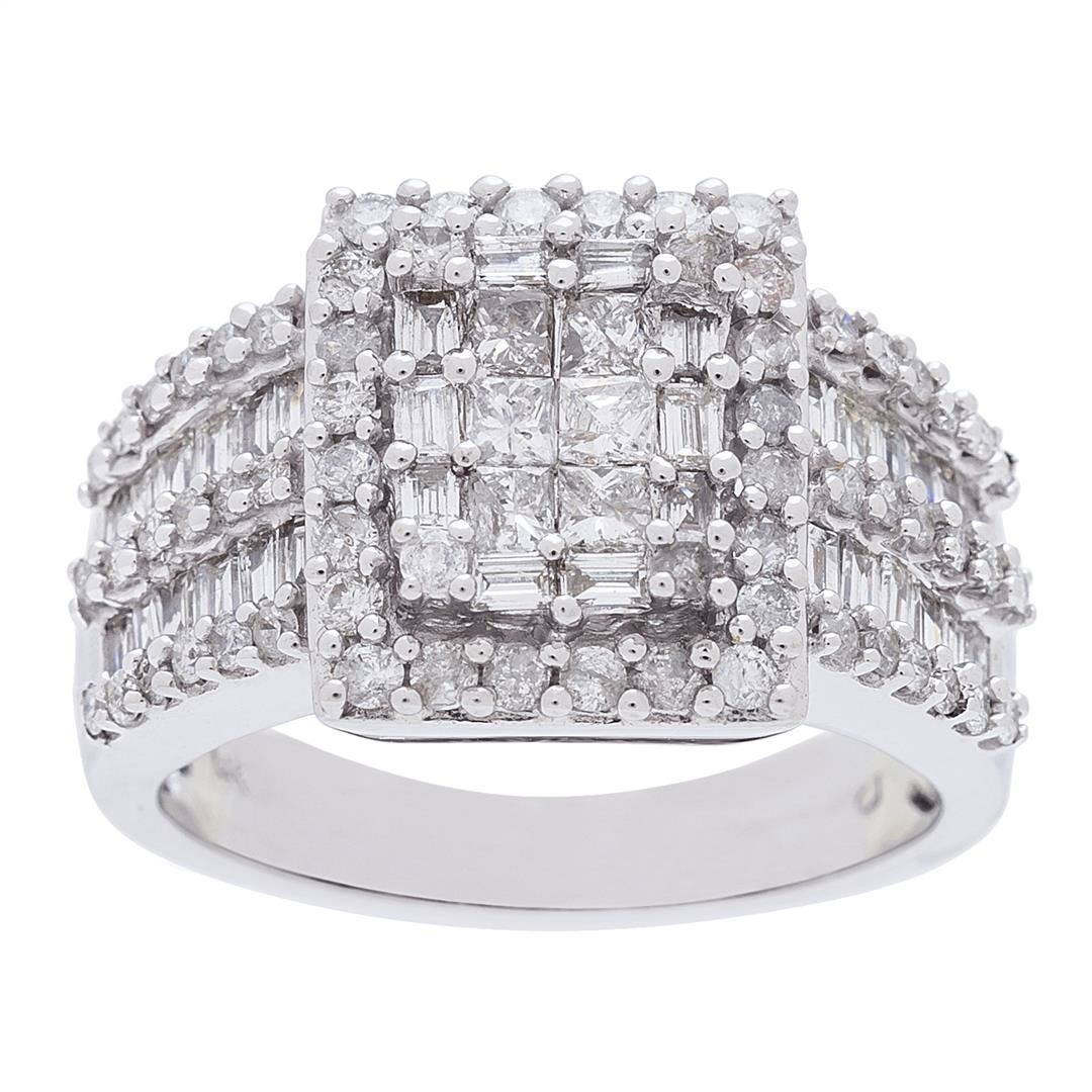One lady's ring featuring: 14KT white gold weighing 6.23 grams containing round, pear cut and baguette cut diamonds weighing 1.44ctw.