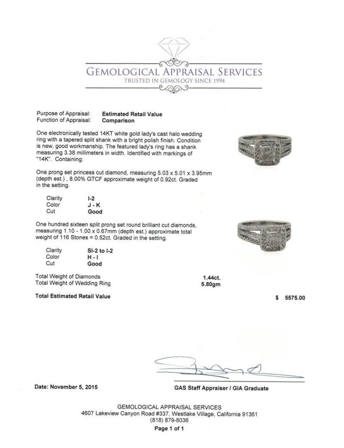 One electronically tested 14KT white gold lady's cast halo wedding ring with a tapered split shank with a bright polish finish. The featured lady's ring has a shank measuring 3.38 millimeters in width. Identified with markings of "14K". Condition is new, good workmanship. Containing: One prong set princess cut diamond, measuring 5.03 x 5.01 x 3.95mm (depth est.) , 8.00% GTCF approximate weight of 0.92ct. Graded in the setting. Clarity: I-2. Color: J - K. Cut Good One Hundred Sixteen split prong set round brilliant cut diamonds, measuring 1.10 - 1.00 x 0.67mm (depth est.) approximate total weight of 116 Stones = 0.52ct. Graded in the setting. Clarity: SI-2 to I-2. Color: H - I. Cut Good. Total Weight of Diamonds 1.44ct. Total Weight of Wedding Ring 5.80gm. GAS Appraised.