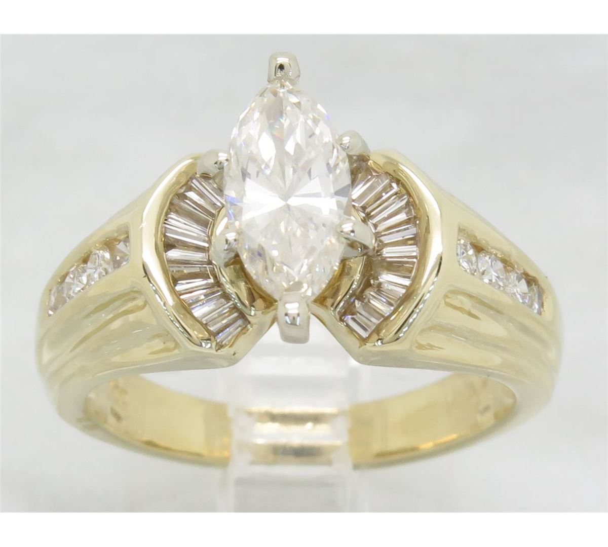 One tested 14K yellow gold diamond ring. Containing: One Marquise Cut Diamond. Approximate size: 1.00CT, Clarity: SI2, Color: H. 14 Baguette Cut Diamonds, 8 Round Brilliant Cut Diamonds. Approximate total diamond weight: 1.44CTW. All diamonds are graded in the mounting unless otherwise stated. Weight of ring: 6.2 grams, Size: 6.5.