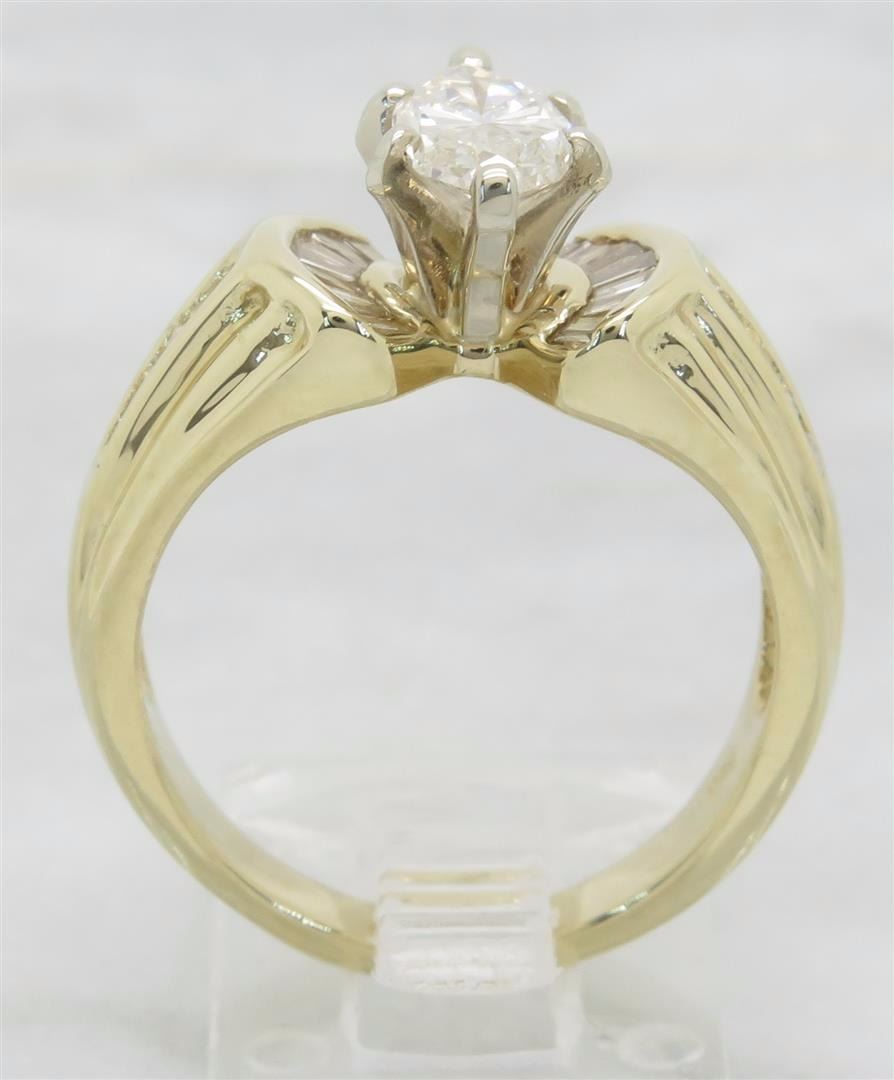 One tested 14K yellow gold diamond ring. Containing: One Marquise Cut Diamond. Approximate size: 1.00CT, Clarity: SI2, Color: H. 14 Baguette Cut Diamonds, 8 Round Brilliant Cut Diamonds. Approximate total diamond weight: 1.44CTW. All diamonds are graded in the mounting unless otherwise stated. Weight of ring: 6.2 grams, Size: 6.5.