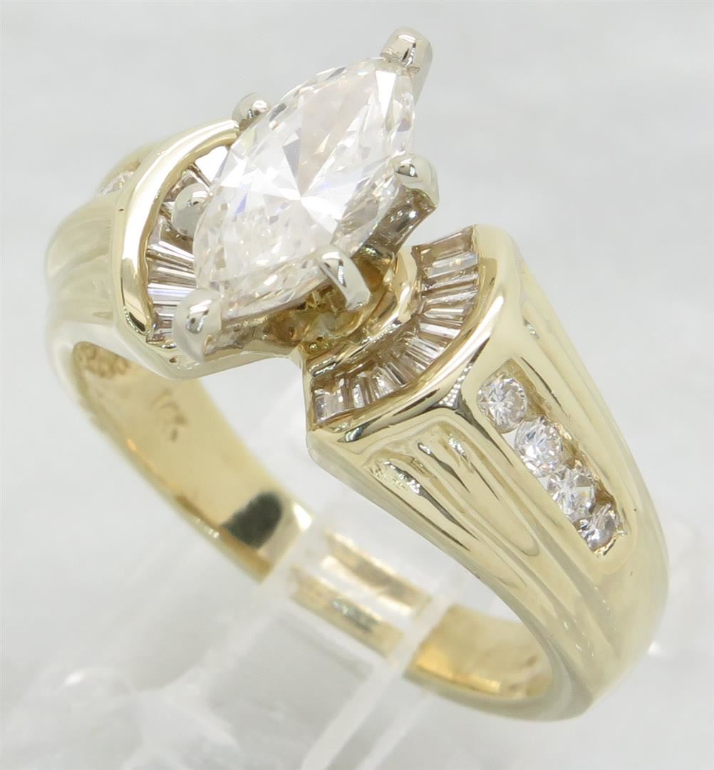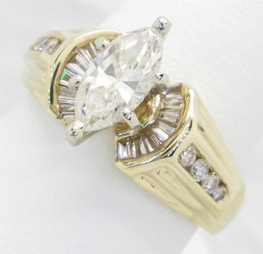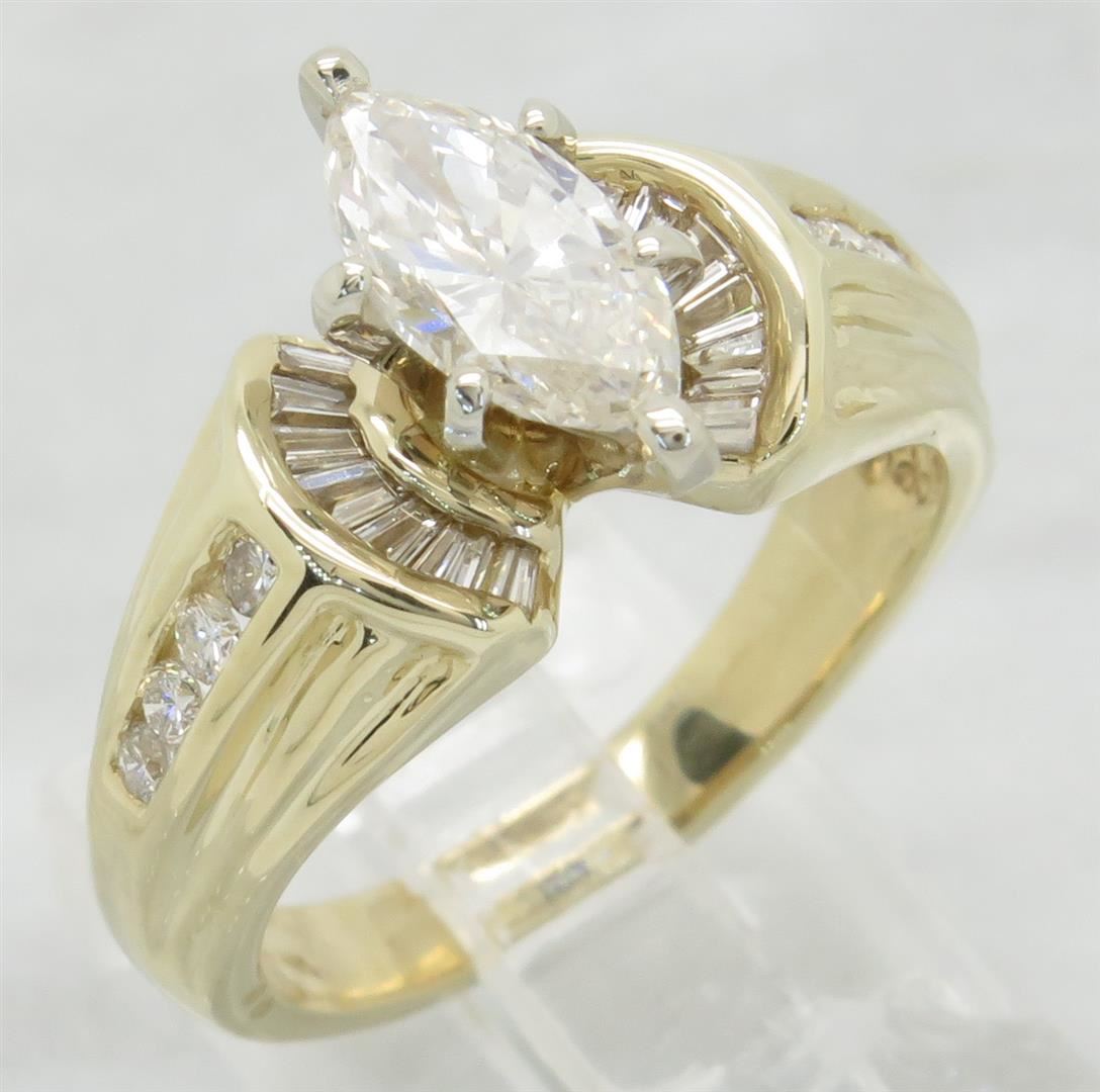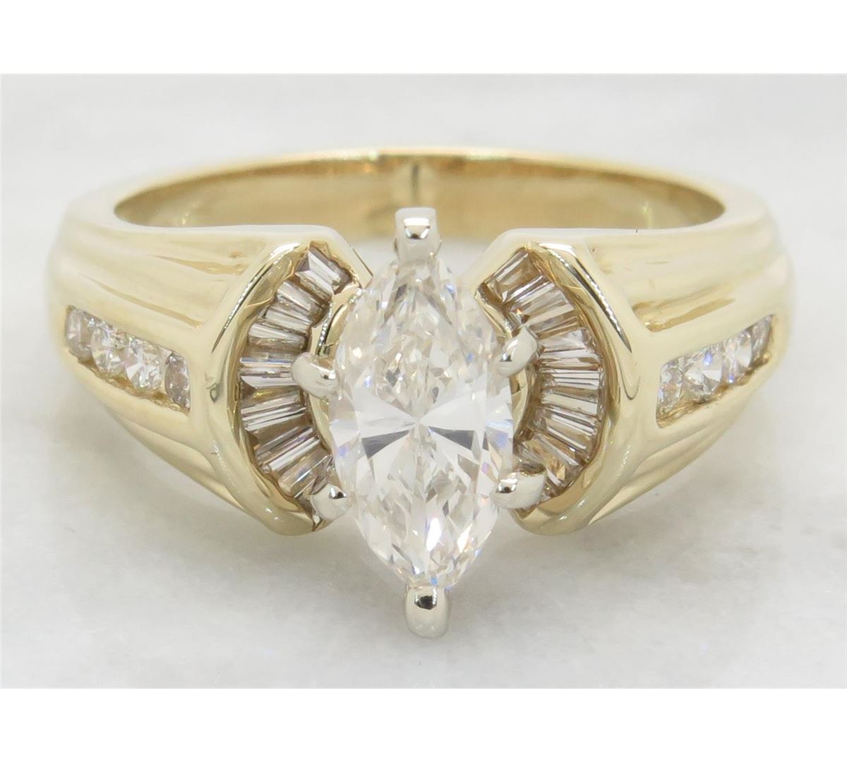One tested 14K yellow gold diamond ring. Containing: One Marquise Cut Diamond. Approximate size: 1.00CT, Clarity: SI2, Color: H. 14 Baguette Cut Diamonds, 8 Round Brilliant Cut Diamonds. Approximate total diamond weight: 1.44CTW. All diamonds are graded in the mounting unless otherwise stated. Weight of ring: 6.2 grams, Size: 6.5.