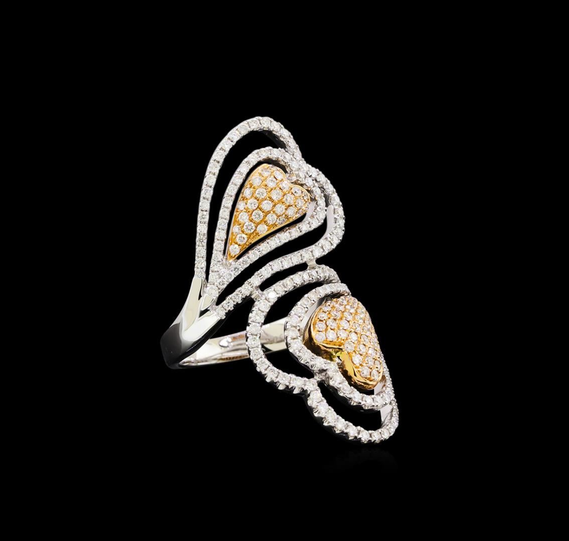 One electronically tested 18KT rose and white gold lady's combination cast & assembled fashion ring with a Double Bypassing Heart with a bright polish finish. The featured lady's ring has a shank measuring 2.84 millimeters in width. Identified with markings of "18K 750". Condition is new, good workmanship. Containing: Two Hundred Thirty-Eight prong set round brilliant cut diamonds, measuring 1.20 - 1.10 x 0.71mm (depth est.) approximate total weight of 238 Stones = 1.44ct. Graded in the setting. Clarity: VS-1 to SI-1. Color: G - Very Good. Total Weight of Diamonds 1.44ct. Total Weight of Ring 10.10gm. GAS Appraised at $8,345.00.
