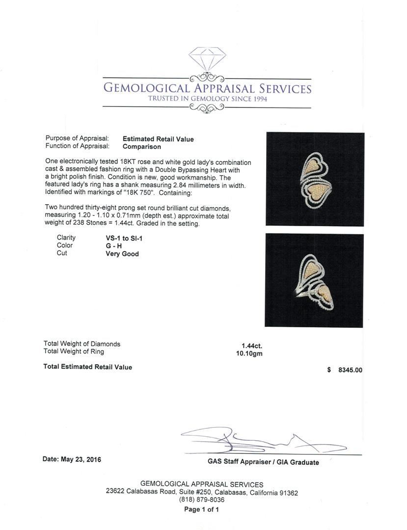 One electronically tested 18KT rose and white gold lady's combination cast & assembled fashion ring with a Double Bypassing Heart with a bright polish finish. The featured lady's ring has a shank measuring 2.84 millimeters in width. Identified with markings of "18K 750". Condition is new, good workmanship. Containing: Two Hundred Thirty-Eight prong set round brilliant cut diamonds, measuring 1.20 - 1.10 x 0.71mm (depth est.) approximate total weight of 238 Stones = 1.44ct. Graded in the setting. Clarity: VS-1 to SI-1. Color: G - Very Good. Total Weight of Diamonds 1.44ct. Total Weight of Ring 10.10gm. GAS Appraised at $8,345.00.