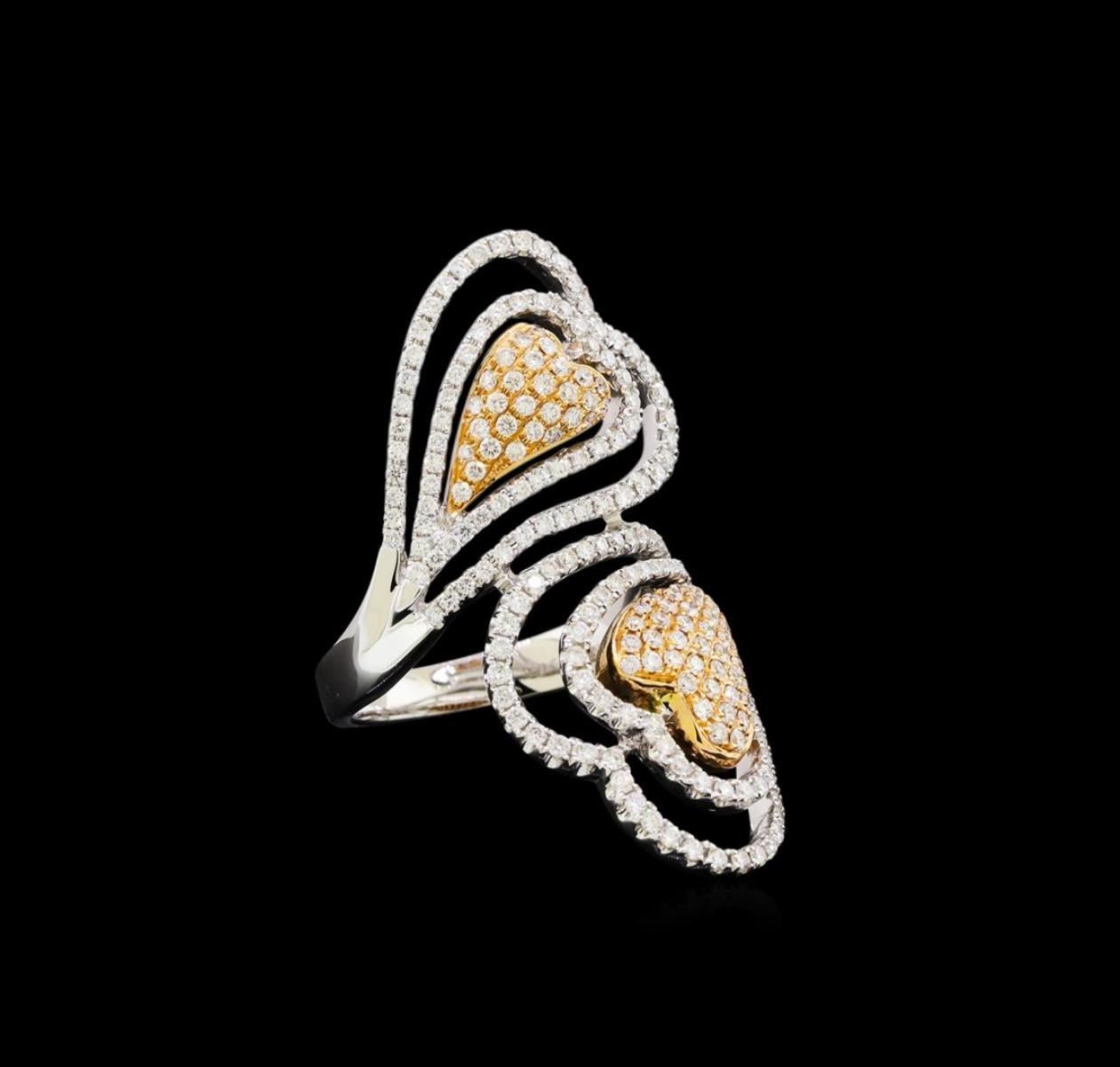One electronically tested 18KT rose and white gold lady's combination cast & assembled fashion ring with a Double Bypassing Heart with a bright polish finish. The featured lady's ring has a shank measuring 2.84 millimeters in width. Identified with markings of "18K 750". Condition is new, good workmanship. Containing: Two Hundred Thirty-Eight prong set round brilliant cut diamonds, measuring 1.20 - 1.10 x 0.71mm (depth est.) approximate total weight of 238 Stones = 1.44ct. Graded in the setting. Clarity: VS-1 to SI-1. Color: G -  Very Good. Total Weight of Diamonds 1.44ct. Total Weight of Ring 10.10gm. GAS Appraised.