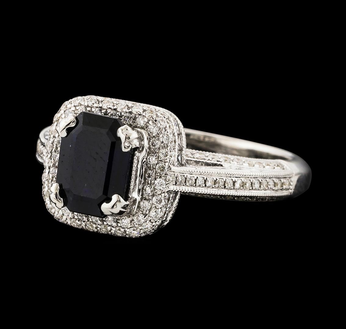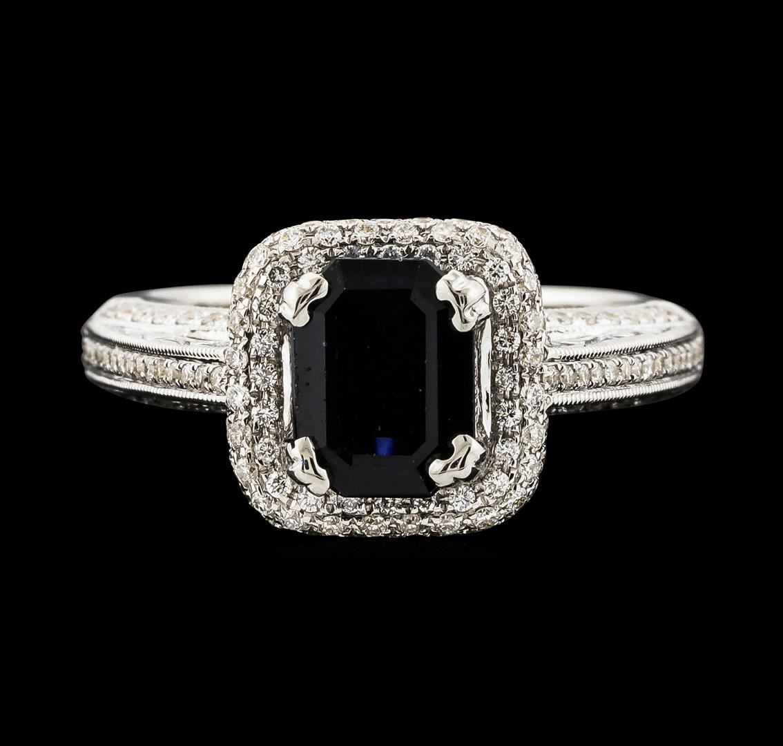 One electronically tested 18KT white gold lady's combination cast & assembled fashion ring with a cathedral shank with a basket halo with a bright polish with milgrain detailing finish. The featured lady's ring has a shank measuring 2.69 millimeters wide. Identified with markings of '18K 750'. Condition is new, good workmanship. Containing: One prong set emerald standard step cut natural blue sapphire, measuring 7.84 x 6.00 x 2.82mm, (depth est.) approximate weight of 1.44ct., clarity is slightly included, dark, strong, blue color, (GIA B 7/5), cut is good. Transmitting light somewhat diffusely, semi-transparent to translucent. Colored gemstones are presumed to have been subjected to commonly used enhancement processes. Graded in the setting. Twenty-Four channel set princess cut diamonds, measuring 1.60 x 1.40 x 1.05mm (depth est.) approximate total weight of 24 Stones = 0.45ct. Graded in the setting. Clarity VS-2 to SI-1. Color: H - I Cut Very Good One Hundred Fifty-Two prong set round brilliant cut diamonds, measuring 1.00 - 0.85 x 0.56mm (depth est.) approximate total weight of 152 Stones = 0.40ct. Graded in the setting. Clarity VS-2 to SI-2. Color: G - I Cut Good. Total Weight of Colored Stones 1.44ct.. Total Weight of Diamonds 0.85ct.. Total Weight of Ring 8.80gm. GAS Appraised.