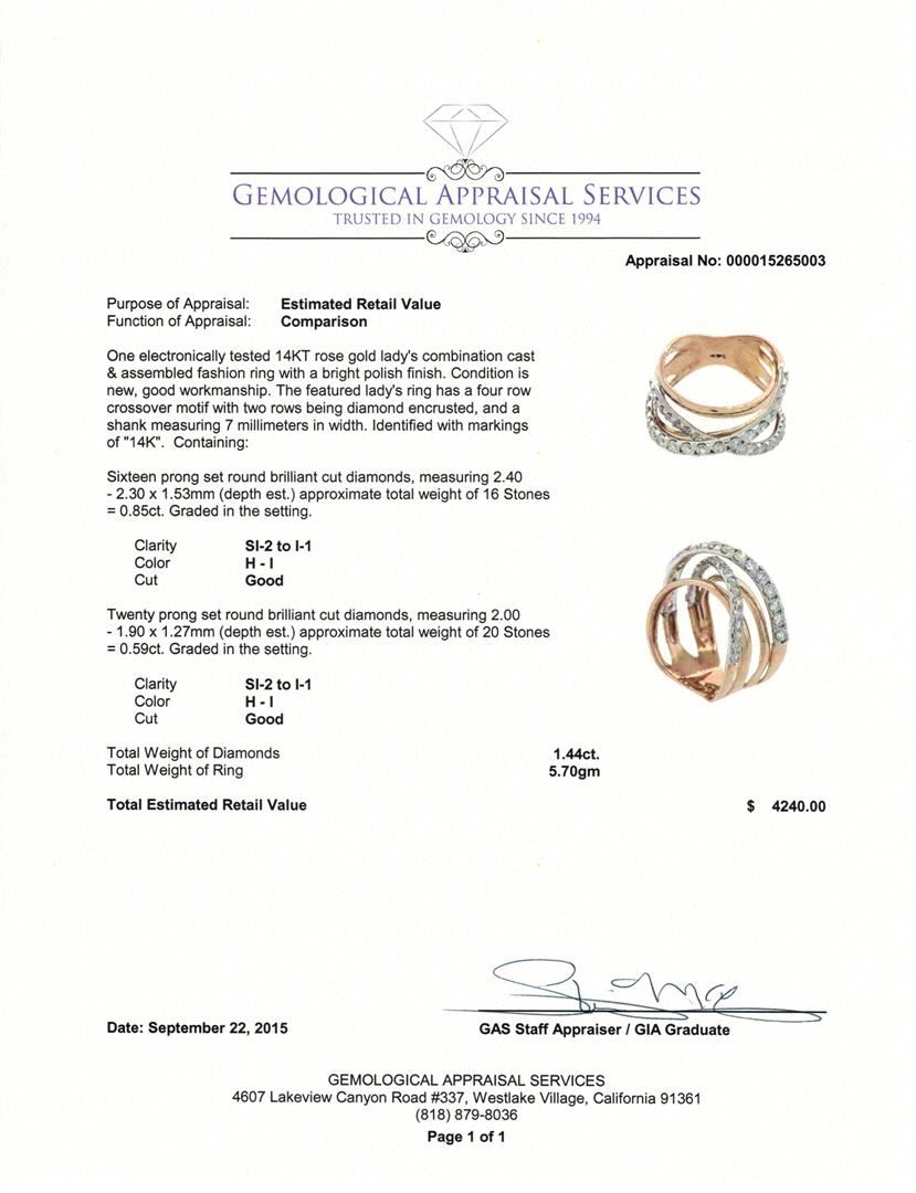 One electronically tested 14KT rose gold lady's combination cast & assembled fashion ring with a bright polish finish. The featured lady's ring has a four row crossover motif with two rows being diamond encrusted, and a shank measuring 7 millimeters in width. Identified with markings of "14K". Condition is new, good workmanship. Containing: Sixteen prong set round brilliant cut diamonds, measuring 2.40 - 2.30 x 1.53mm (depth est.) approximate total weight of 16 Stones = 0.85ct. Graded in the setting. Clarity: SI-2 to I-1. Color: H - I. Cut Good Twenty prong set round brilliant cut diamonds, measuring 2.00 - 1.90 x 1.27mm (depth est.) approximate total weight of 20 Stones = 0.59ct. Graded in the setting. Clarity: SI-2 to I-1. Color: H - I. Cut Good. Total Weight of Diamonds 1.44ct. Total Weight of Ring 5.70gm at $4240.00.. GAS Appraised at $4,240.00.