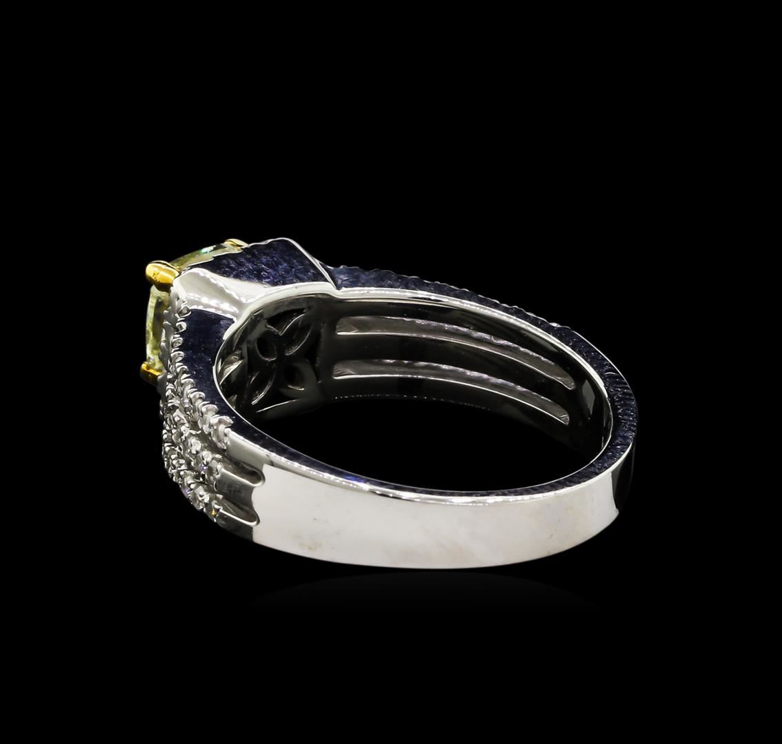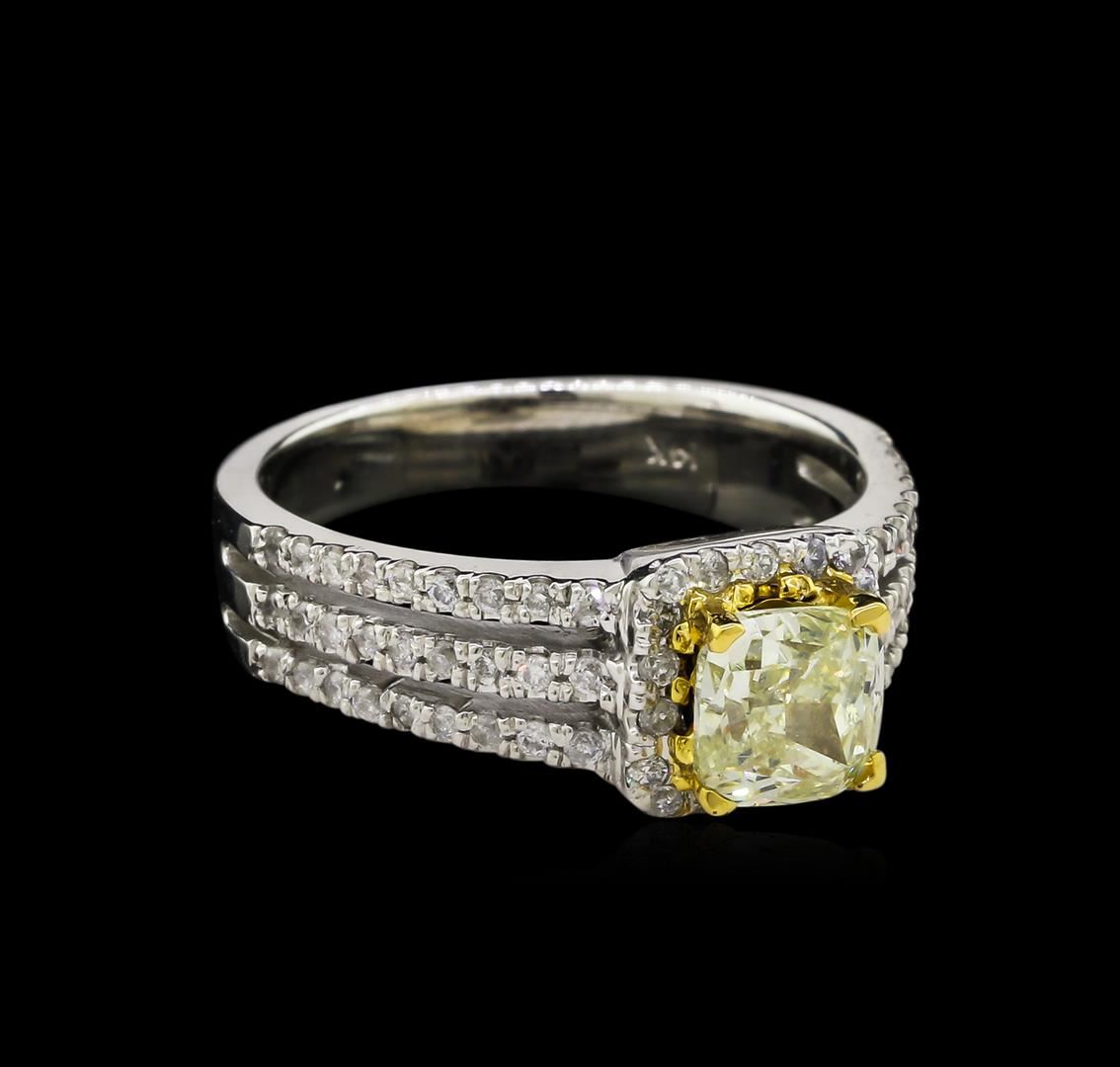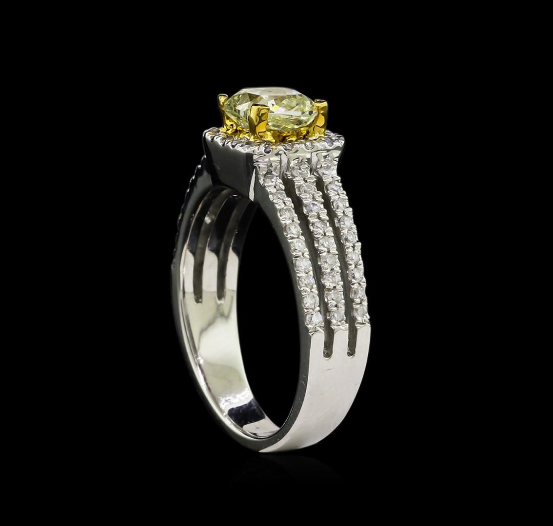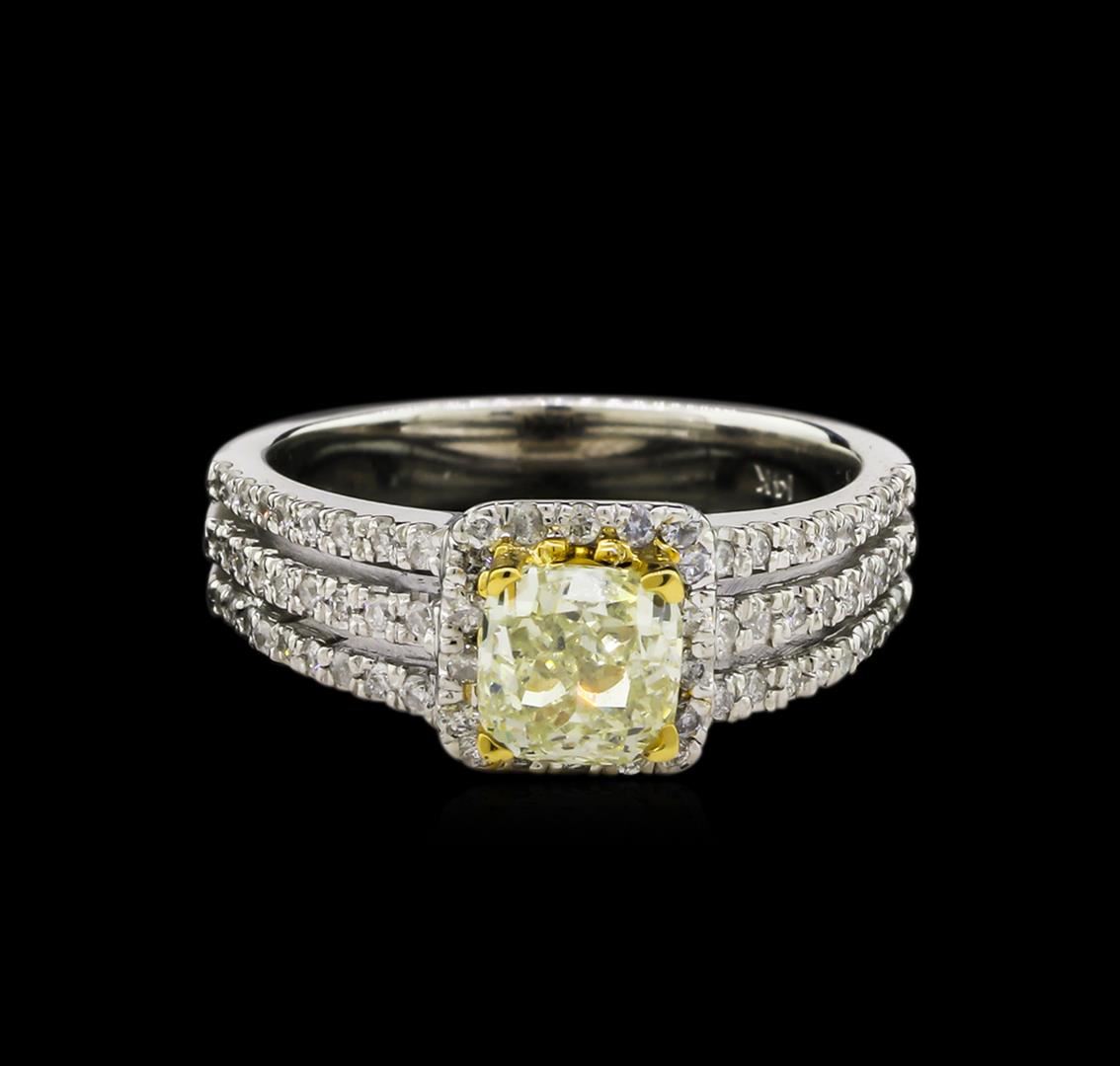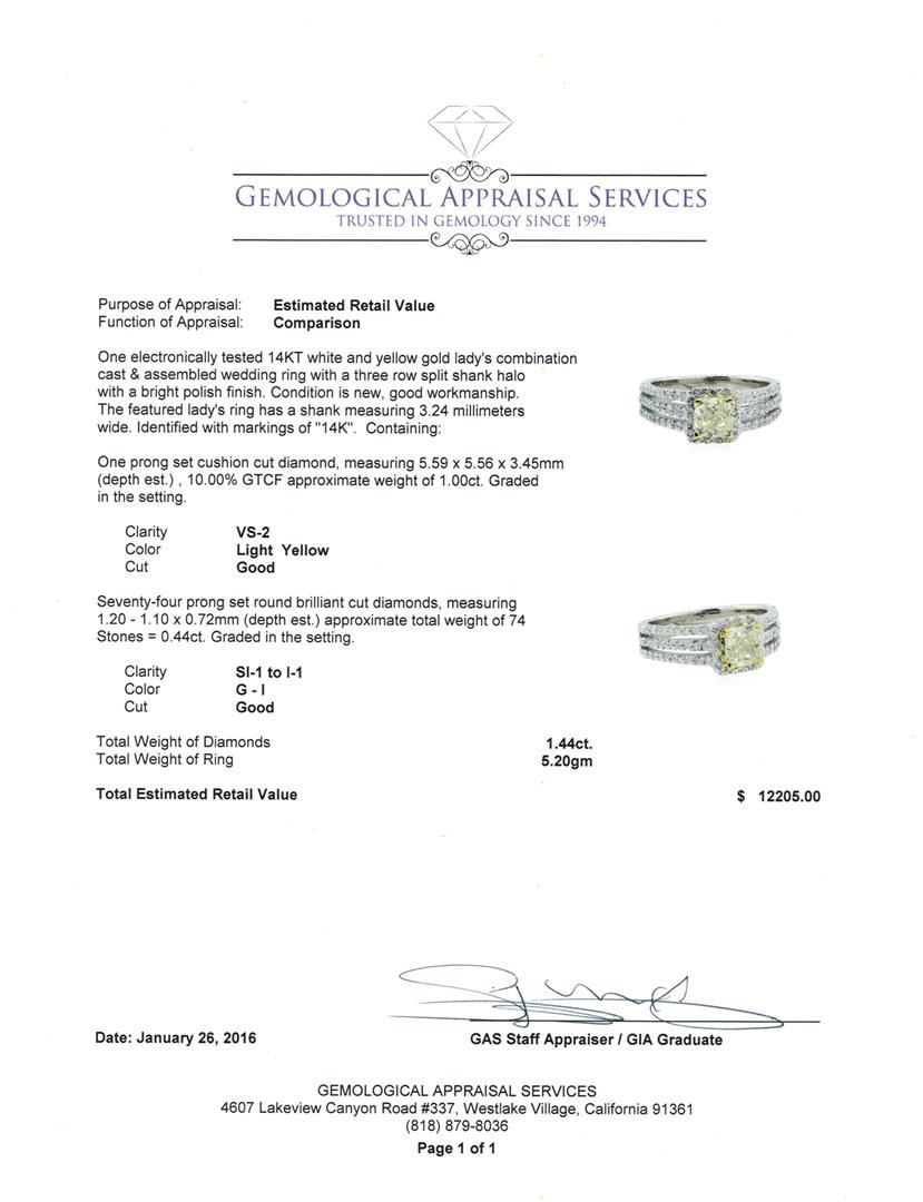 One electronically tested 14KT white and yellow gold lady's combination cast & assembled wedding ring with a three row split shank halo with a bright polish finish. The featured lady's ring has a shank measuring 3.24 millimeters wide. Identified with markings of "14K". Condition is new, good workmanship. Containing: One prong set cushion cut diamond, measuring 5.59 x 5.56 x 3.45mm (depth est.) , 10.00.%. GTCF approximate weight of 1.00ct. Graded in the setting. Clarity: VS-2 Cut Good Seventy-Four prong set round brilliant cut diamonds, measuring 1.20 - 1.10 x 0.72mm (depth est.) approximate total weight of 74 Stones = 0.44ct. Graded in the setting. Clarity: SI-1 to I-1. Color: G - I. Cut Good. Total Weight of Diamonds 1.44ct. Total Weight of Ring 5.20gm. GAS Appraised at $12,205.00.