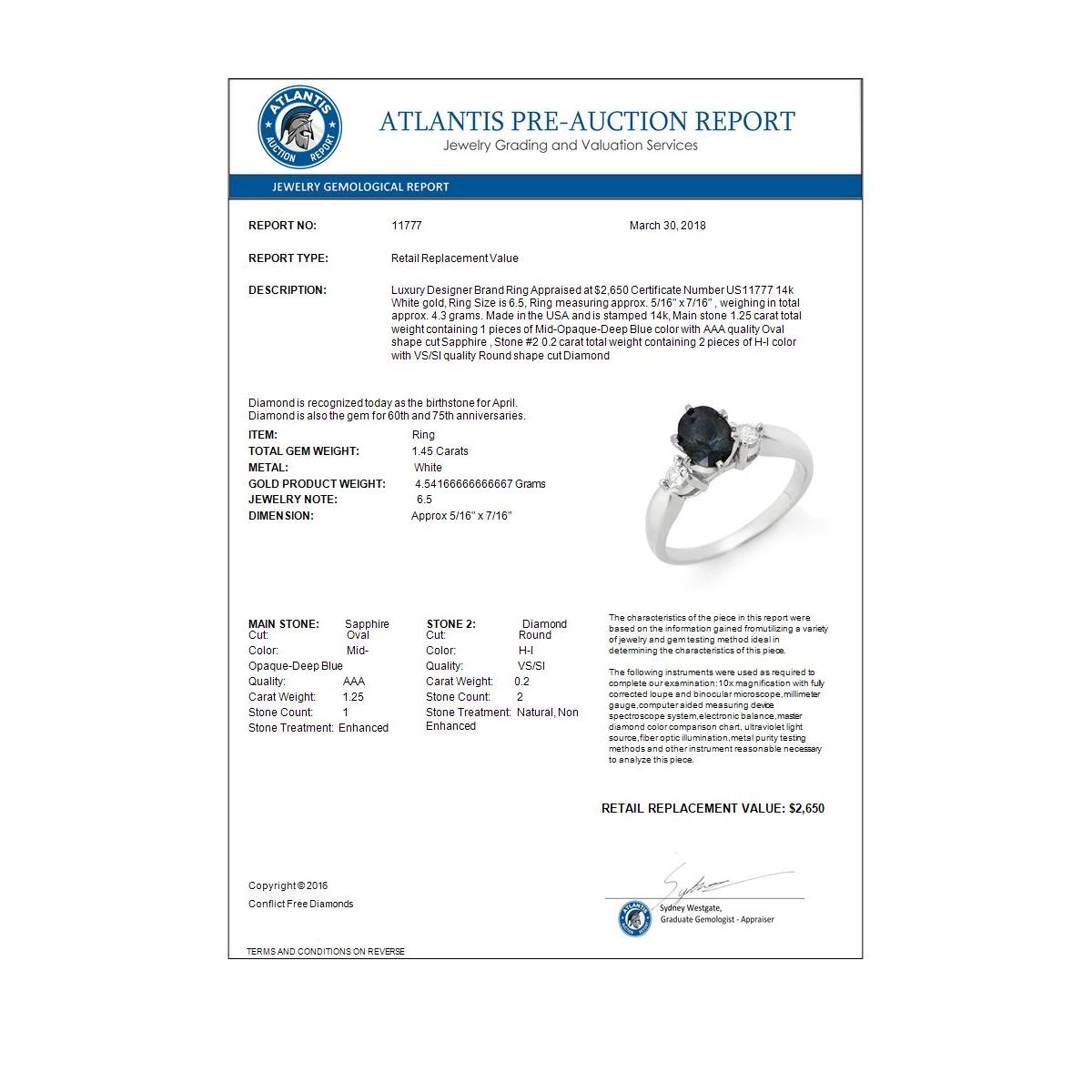 REF-43W6F -11777 ---- 1.45 CTW Blue Sapphire & Diamond Ring 14K White Gold ---- Luxury Designer Brand Ring Appraised at $2,650 Certificate Number US11777 14k White gold, Ring Size is 6.5, Ring measuring approx. 5/16" x 7/16" , weighing in total approx. 4.3 grams. Made in the USA and is stamped 14k, Main stone 1.25 carat total weight containing 1 pieces of Mid-Opaque-Deep Blue color with AAA quality Oval shape cut Sapphire , Stone #2 0.2 carat total weight containing 2 pieces of H-I color with VS/SI quality Round shape cut Diamond
