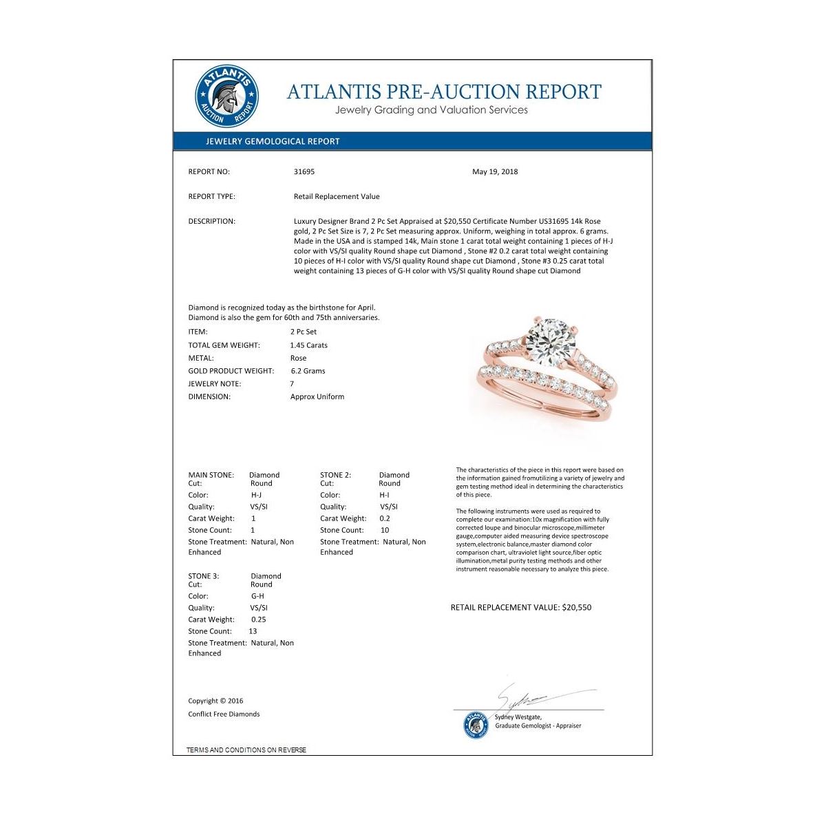 REF-373A8X -31695 ---- 1.45 CTW Certified VS/SI Diamond Solitaire 2Pc Wedding Set 14K Rose Gold ---- Luxury Designer Brand 2 Pc Set Appraised at $20,550 Certificate Number US31695 14k Rose gold, 2 Pc Set Size is 7, 2 Pc Set measuring approx. Uniform, weighing in total approx. 6 grams. Made in the USA and is stamped 14k, Main stone 1 carat total weight containing 1 pieces of H-J color with VS/SI quality Round shape cut Diamond , Stone #2 0.2 carat total weight containing 10 pieces of H-I color with VS/SI quality Round shape cut Diamond , Stone #3 0.25 carat total weight containing 13 pieces of G-H color with VS/SI quality Round shape cut Diamond