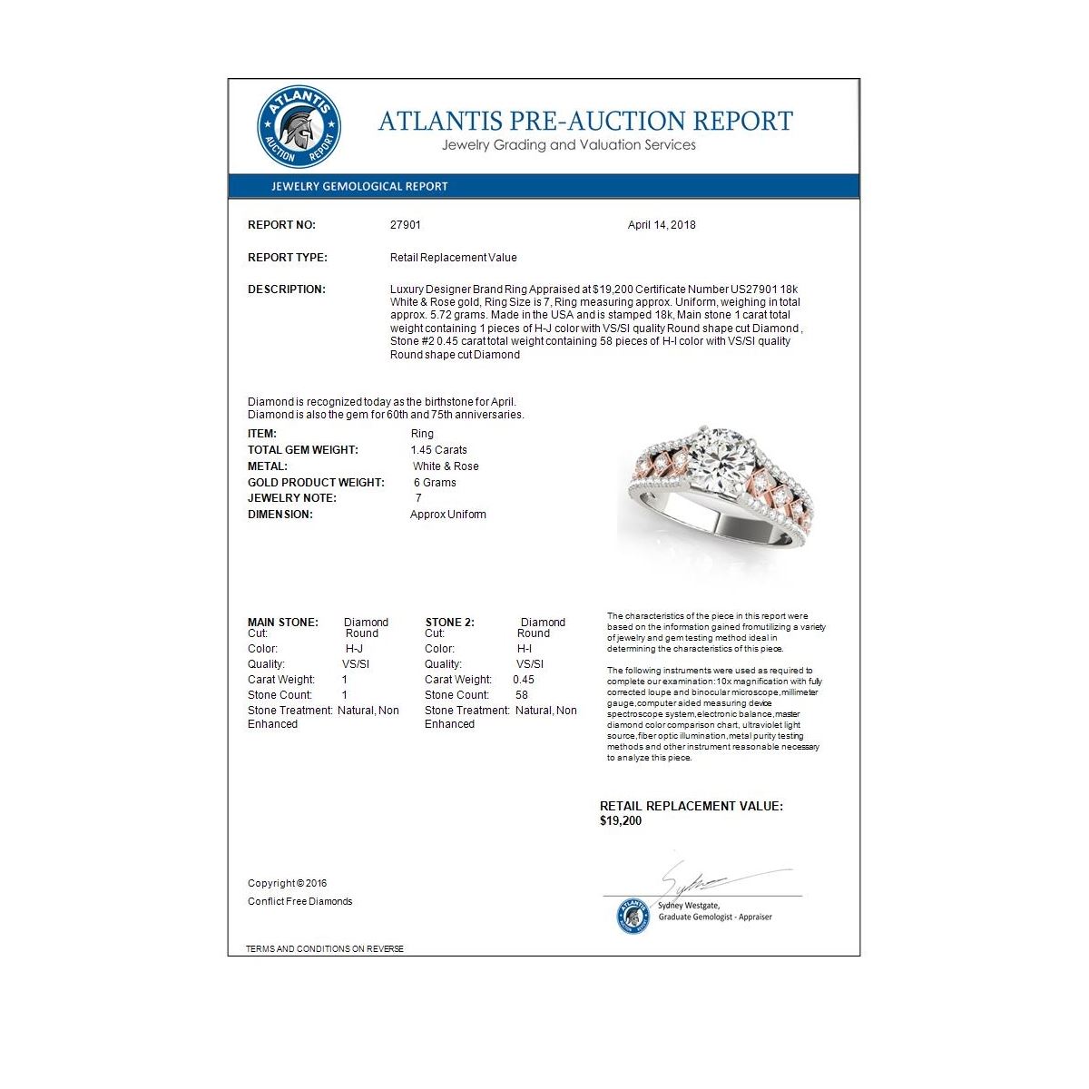 REF-388M2H -27901 ---- 1.45 CTW Certified VS/SI Diamond Solitaire Ring 18K White & Rose Gold ---- Luxury Designer Brand Ring Appraised at $19,200 Certificate Number US27901 18k White & Rose gold, Ring Size is 7, Ring measuring approx. Uniform, weighing in total approx. 5.72 grams. Made in the USA and is stamped 18k, Main stone 1 carat total weight containing 1 pieces of H-J color with VS/SI quality Round shape cut Diamond , Stone #2 0.45 carat total weight containing 58 pieces of H-I color with VS/SI quality Round shape cut Diamond