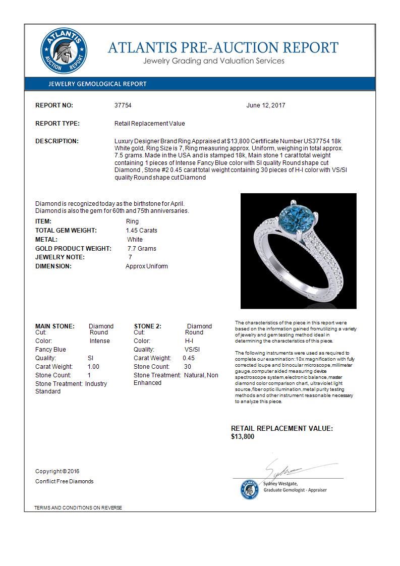 1.45 CTW Fancy Intense Blue Diamond Solitaire Art Deco Ring 18K White Gold ---- Luxury Designer Brand Ring Appraised Retail Price at $13,800 ---- SKU Number US37754 18k White gold Ring Size is 7, Ring measuring approx. Uniform, weighing in total approx. 7.5 grams. Made in the USA and is stamped 18k, Main stone 1.00 carat total weight containing 1 pieces of Intense Fancy Blue color with SI quality Round shape cut Diamond , Stone #2 0.45 carat total weight containing 30 pieces of H-I color with VS/SI quality Round shape cut