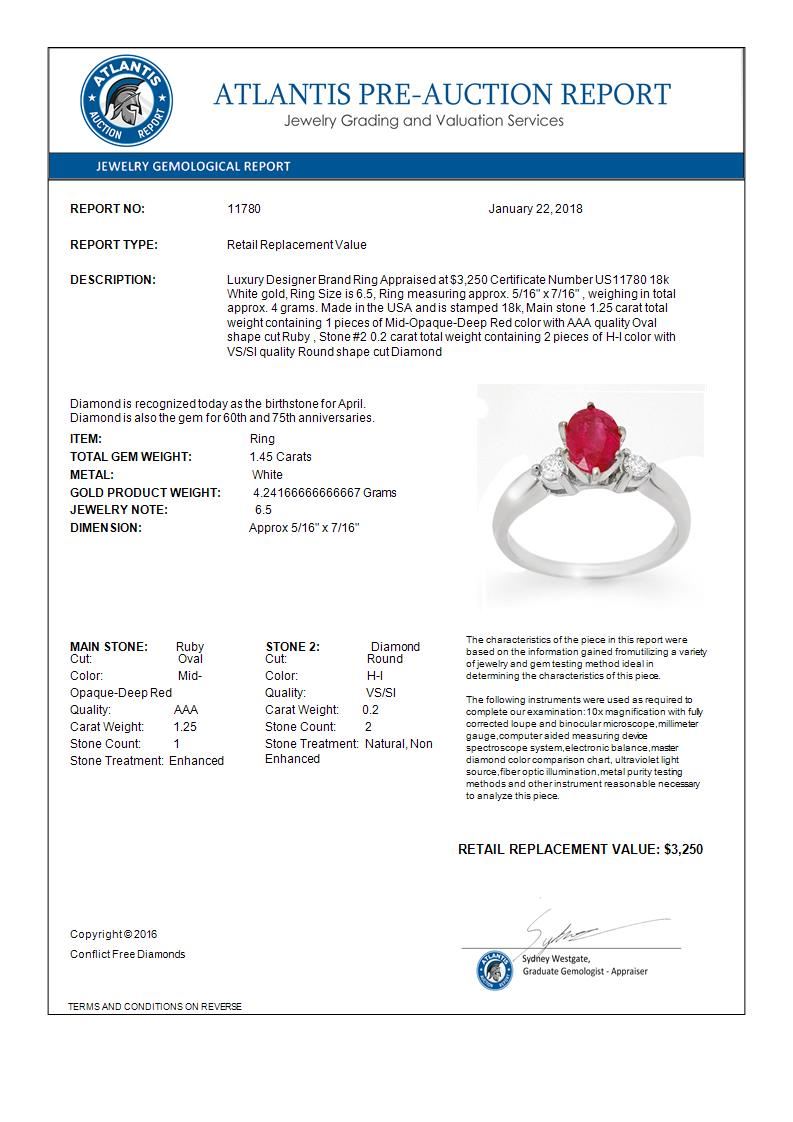 REF-45Y5K -11780 ---- 1.45 CTW Ruby & Diamond Ring 18K White Gold ---- Luxury Designer Brand Ring Appraised at $3,250 Certificate Number US11780 18k White gold, Ring Size is 6.5, Ring measuring approx. 5/16" x 7/16" , weighing in total approx. 4 grams. Made in the USA and is stamped 18k, Main stone 1.25 carat total weight containing 1 pieces of Mid-Opaque-Deep Red color with AAA quality Oval shape cut Ruby , Stone #2 0.2 carat total weight containing 2 pieces of H-I color with VS/SI quality Round shape cut Diamond