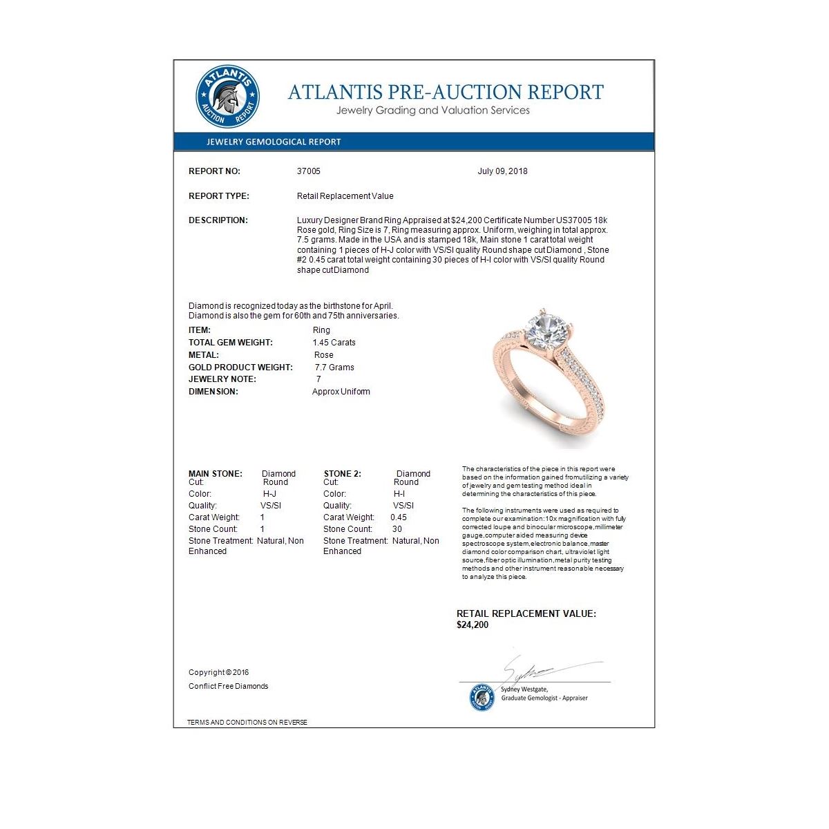 REF-400M2H -37005 ---- 1.45 CTW VS/SI Diamond Solitaire Art Deco Ring 18K Rose Gold ---- Luxury Designer Brand Ring Appraised at $24,200 Certificate Number US37005 18k Rose gold, Ring Size is 7, Ring measuring approx. Uniform, weighing in total approx. 7.5 grams. Made in the USA and is stamped 18k, Main stone 1 carat total weight containing 1 pieces of H-J color with VS/SI quality Round shape cut Diamond , Stone #2 0.45 carat total weight containing 30 pieces of H-I color with VS/SI quality Round shape cut Diamond