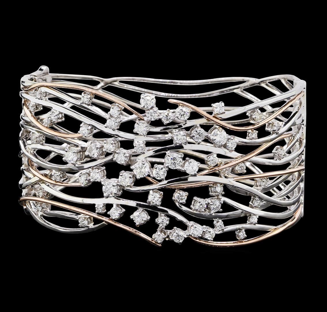 One electronically tested 14KT rose and white gold lady's combination cast & assembled fashion bangle bracelet with a double plunger clasp with a bright polish finish. The featured lady's bracelet has a freeform wave motif and measures approximately 7.5 inches in length. Identified with markings of 'K14'. Condition is new, good workmanship. Containing: Five prong set round brilliant cut diamonds, measuring 3.50 - 3.40 x 2.07mm (depth est.) approximate total weight of 5 Stones = 0.75ct. Graded in the setting. Clarity SI-1 to I-1. Color: H - I Cut Good Seven prong set round brilliant cut diamonds, measuring 3.00 - 2.95 x 1.85mm (depth est.) approximate total weight of 7 Stones = 0.70ct. Graded in the setting. Clarity SI-1 to SI-2. Color: H - I Cut Good Eleven prong set round brilliant cut diamonds, measuring 2.75 - 2.65 x 1.67mm (depth est.) approximate total weight of 11 Stones = 0.82ct. Graded in the setting. Clarity SI-1 to I-1. Color: H - I Cut Good Fifteen prong set round brilliant cut diamonds, measuring 2.50 - 2.35 x 1.48mm (depth est.) approximate total weight of 15 Stones = 0.80ct. Graded in the setting. Clarity SI-1 to SI-2. Color: H - I Cut Good Nine prong set round brilliant cut diamonds, measuring 2.10 - 2.00 x 1.27mm (depth est.) approximate total weight of 9 Stones = 0.30ct. Graded in the setting. Clarity SI-1 to SI-2. Color: H - I Cut Good Sixteen prong set round brilliant cut diamonds, measuring 1.85 - 1.75 x 1.12mm (depth est.) approximate total weight of 16 Stones = 0.36ct. Graded in the setting. Clarity SI-1 to I-1. Color: H - I Cut Good. Total Weight of Diamonds 3.73ct.. Total Weight of Bangle Bracelet 51.70gm. GAS Appraised.