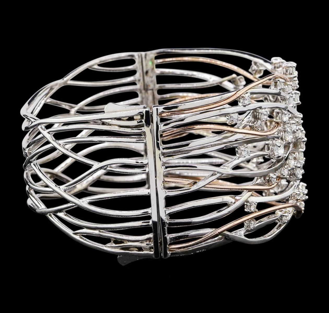 One electronically tested 14KT rose and white gold lady's combination cast & assembled fashion bangle bracelet with a double plunger clasp with a bright polish finish. The featured lady's bracelet has a freeform wave motif and measures approximately 7.5 inches in length. Identified with markings of 'K14'. Condition is new, good workmanship. Containing: Five prong set round brilliant cut diamonds, measuring 3.50 - 3.40 x 2.07mm (depth est.) approximate total weight of 5 Stones = 0.75ct. Graded in the setting. Clarity SI-1 to I-1. Color: H - I Cut Good Seven prong set round brilliant cut diamonds, measuring 3.00 - 2.95 x 1.85mm (depth est.) approximate total weight of 7 Stones = 0.70ct. Graded in the setting. Clarity SI-1 to SI-2. Color: H - I Cut Good Eleven prong set round brilliant cut diamonds, measuring 2.75 - 2.65 x 1.67mm (depth est.) approximate total weight of 11 Stones = 0.82ct. Graded in the setting. Clarity SI-1 to I-1. Color: H - I Cut Good Fifteen prong set round brilliant cut diamonds, measuring 2.50 - 2.35 x 1.48mm (depth est.) approximate total weight of 15 Stones = 0.80ct. Graded in the setting. Clarity SI-1 to SI-2. Color: H - I Cut Good Nine prong set round brilliant cut diamonds, measuring 2.10 - 2.00 x 1.27mm (depth est.) approximate total weight of 9 Stones = 0.30ct. Graded in the setting. Clarity SI-1 to SI-2. Color: H - I Cut Good Sixteen prong set round brilliant cut diamonds, measuring 1.85 - 1.75 x 1.12mm (depth est.) approximate total weight of 16 Stones = 0.36ct. Graded in the setting. Clarity SI-1 to I-1. Color: H - I Cut Good. Total Weight of Diamonds 3.73ct.. Total Weight of Bangle Bracelet 51.70gm. GAS Appraised.