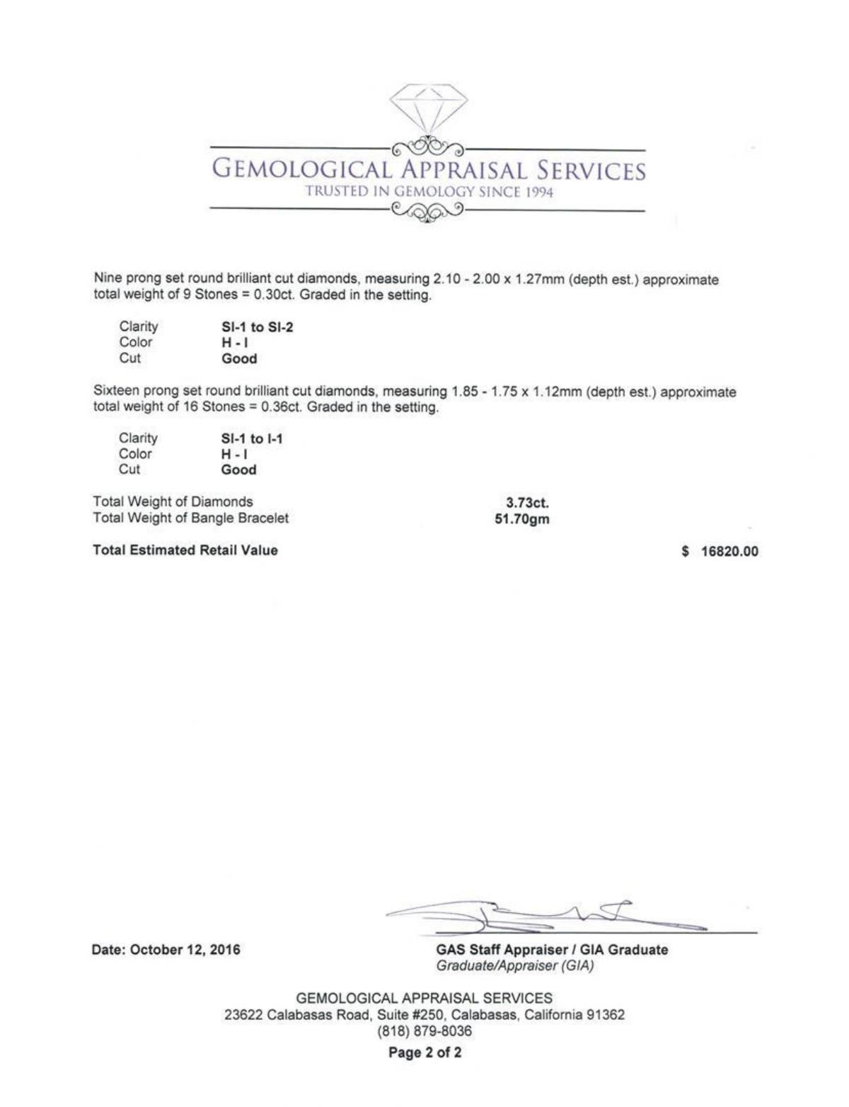 One electronically tested 14KT rose and white gold lady's combination cast & assembled fashion bangle bracelet with a double plunger clasp with a bright polish finish. The featured lady's bracelet has a freeform wave motif and measures approximately 7.5 inches in length. Identified with markings of 'K14'. Condition is new, good workmanship. Containing: Five prong set round brilliant cut diamonds, measuring 3.50 - 3.40 x 2.07mm (depth est.) approximate total weight of 5 Stones = 0.75ct. Graded in the setting. Clarity SI-1 to I-1. Color: H - I Cut Good Seven prong set round brilliant cut diamonds, measuring 3.00 - 2.95 x 1.85mm (depth est.) approximate total weight of 7 Stones = 0.70ct. Graded in the setting. Clarity SI-1 to SI-2. Color: H - I Cut Good Eleven prong set round brilliant cut diamonds, measuring 2.75 - 2.65 x 1.67mm (depth est.) approximate total weight of 11 Stones = 0.82ct. Graded in the setting. Clarity SI-1 to I-1. Color: H - I Cut Good Fifteen prong set round brilliant cut diamonds, measuring 2.50 - 2.35 x 1.48mm (depth est.) approximate total weight of 15 Stones = 0.80ct. Graded in the setting. Clarity SI-1 to SI-2. Color: H - I Cut Good Nine prong set round brilliant cut diamonds, measuring 2.10 - 2.00 x 1.27mm (depth est.) approximate total weight of 9 Stones = 0.30ct. Graded in the setting. Clarity SI-1 to SI-2. Color: H - I Cut Good Sixteen prong set round brilliant cut diamonds, measuring 1.85 - 1.75 x 1.12mm (depth est.) approximate total weight of 16 Stones = 0.36ct. Graded in the setting. Clarity SI-1 to I-1. Color: H - I Cut Good. Total Weight of Diamonds 3.73ct.. Total Weight of Bangle Bracelet 51.70gm. GAS Appraised.