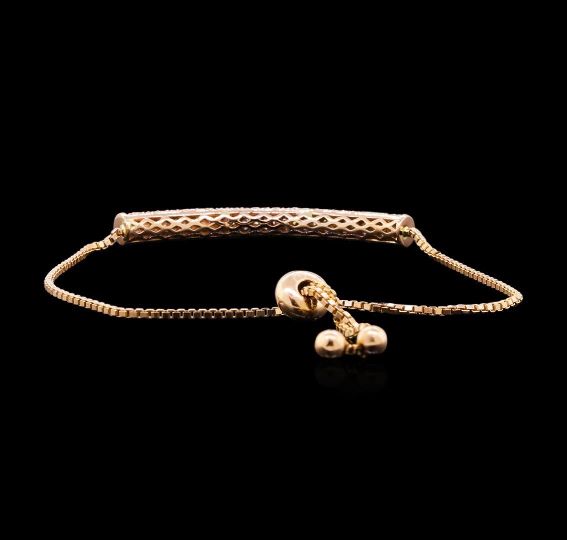 One electronically tested 14KT rose gold lady's combination cast & assembled fashion adjustable bracelet with a slide clasp with a bright polish finish. The featured lady's adjustable bracelet measures from 8.5 inches to 6 inches in length. Identified with markings of "K14". Condition is new, good workmanship. Containing: Eighty-Seven prong set round brilliant cut diamonds, measuring 1.45 - 1.40 x 0.89mm (depth est.) approximate total weight of 87 Stones = 0.97ct. Graded in the setting. Clarity: SI-1 to I-1. Color: H - I. Cut Good Fifty-Eight prong set round brilliant cut diamonds, measuring 1.30 - 1.20 x 0.78mm (depth est.) approximate total weight of 58 Stones = 0.48ct. Graded in the setting. Clarity: SI-1 to I-1. Color: H - I. Cut Good. Total Weight of Diamonds 1.45ct. Total Weight of Adjustable Bracelet 6.80gm. GAS Appraised.