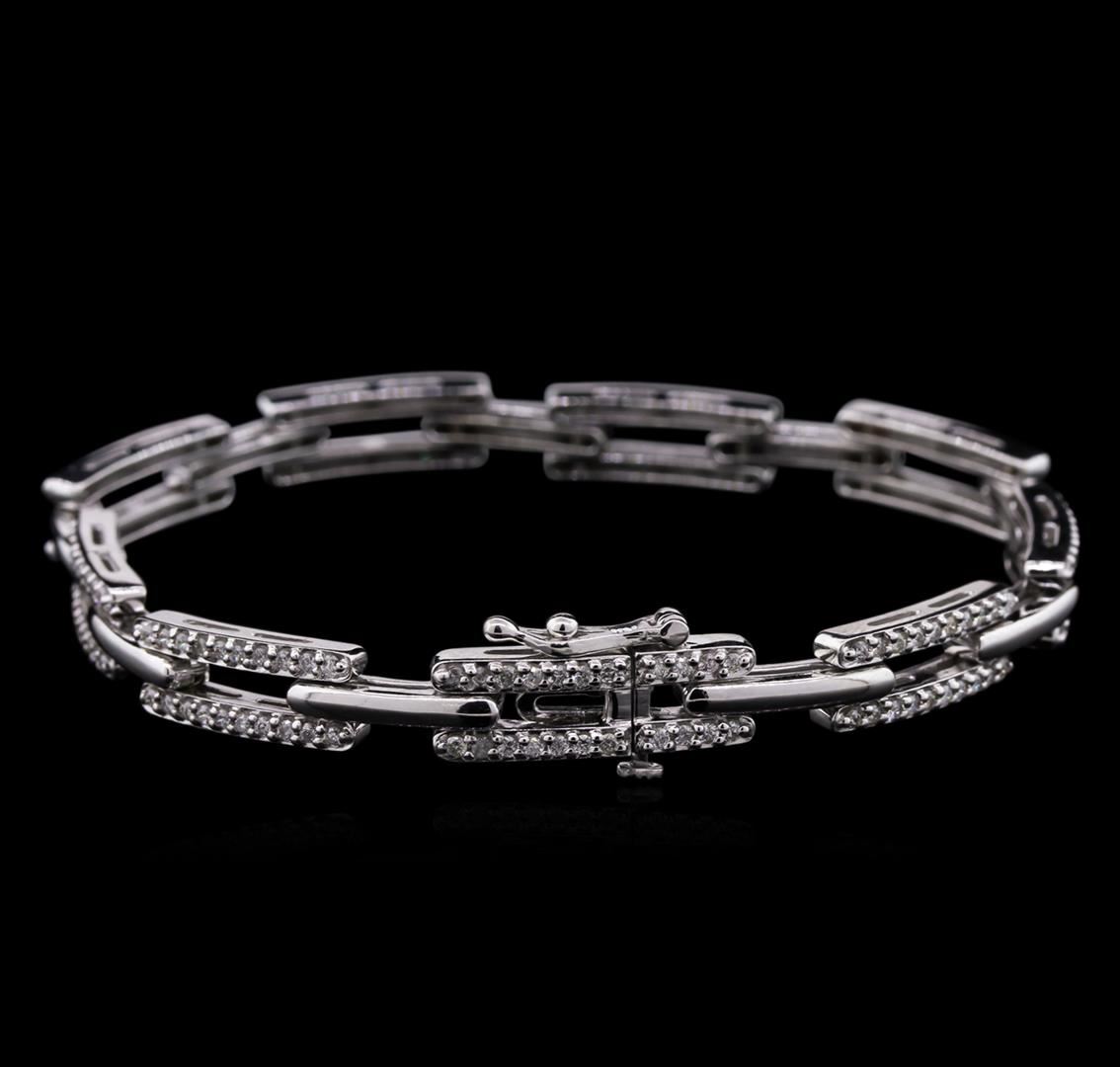One electronically tested 14KT white gold lady's combination cast & assembled fashion bracelet with a tongue clasp with foldover safety with a bright polish finish. The featured lady's bracelet measures approximately 7 inches in length. Identified with markings of "14K". Condition is new, good workmanship. Containing: One Hundred Eighty-Two prong set round brilliant cut diamonds, measuring 1.30 - 1.25 x 0.81mm (depth est.) approximate total weight of 182 Stones = 1.45ct. Graded in the setting. Clarity: SI-1 to SI-2 . Color: H - I. Cut Good. Total Weight of Diamonds 1.45ct.. Total Weight of Bracelet 18.40gm at $ 7965.00 GAS Appraised.