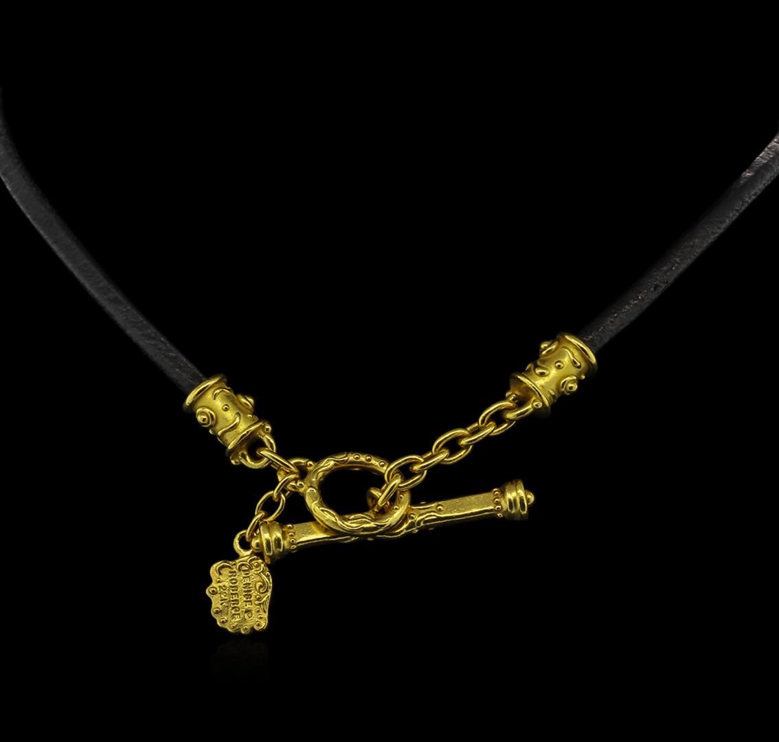One electronically tested 22KT yellow gold ladies custom cast & hand crafted diamond necklace. The necklace was designed by the contemporary designer Denise Roberge. The fifteen and three-quarter inch length necklace features five diamond set rondelle beads supported by a black leather cord, terminating in a stylized 22KT yellow gold toggle clasp with a logo dangle. Bright and satin finish. Trademark is Denise Roberge. Identified with markings of "22K". Condition is good. Containing: Thirty bezel set round brilliant cut diamonds, measuring 2.40 - 2.20 x 1.38mm (depth est.) approximate total weight of 30 Stones = 1.45ct. Graded in the setting. Clarity: VS-1 to SI-1. Color: F - G. Total Weight of Diamonds: 1.45 ct. Total Weight of Necklace: 71.31 gm. AIG Appraised at $25,395.00.