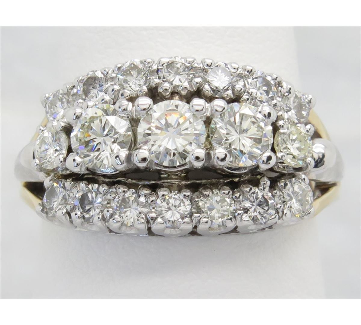 One tested 14K gold diamond ring. Containing: One Round Brilliant Cut Diamond. Approximate size: .23CT, Clarity: SI, Color: H-I. 18 round brilliant cut diamonds. Approximate total diamond weight: 1.45CTW. Diamonds are graded in the mounting, unless otherwise stated. Weight: 5.9 grams, Size: 7.0.