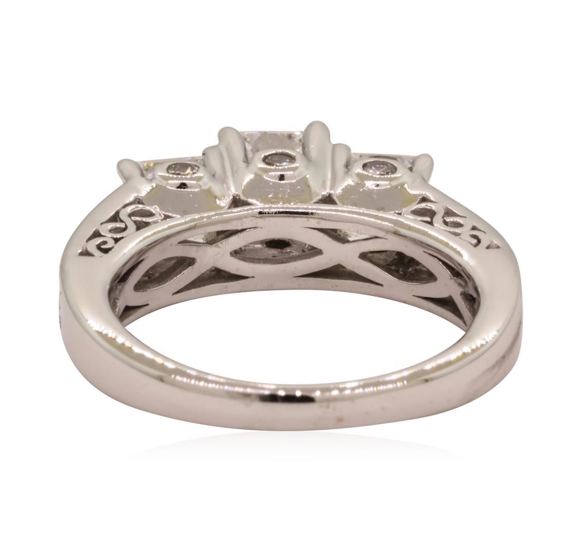 One electronically tested 14KT white gold lady's cast three stone straight line cathedral ring with a bright polish finish. The featured lady's ring has a shank measuring 2.00 millimeters wide. Identified with markings of '14K'. Condition is new, good workmanship. Containing: Three prong set princess cut diamonds, measuring 4.15 x 3.90 x 2.93mm (depth est.) approximate total weight of 3 Stones = 1.00ct. Graded in the setting. Color H - I Clarity VS-2 to SI-1 Cut Very Good Fourteen channel set baguette cut diamonds, measuring from 2.30 x 1.30 x 1.11mm (depth est.) to 2.50 x 1.50 x 1.28mm (depth est.) approximate total weight of 14 Stones = 0.45ct. Graded in the setting. Color H - I Clarity VS-1 to SI-1 Cut Very Good Six bezel set round brilliant cut diamonds, measuring 1.60 - 1.50 x 0.96mm (depth est.) approximate total weight of 6 Stones = 0.08ct. Graded in the setting. Color H - I Clarity SI-1 to SI-2 Cut Good. Total Weight of Diamonds 1.53ct.. Total Weight of Ring 4.60gm GAS Appraised at $4505.00. GAS Appraised at $4,505.00.
