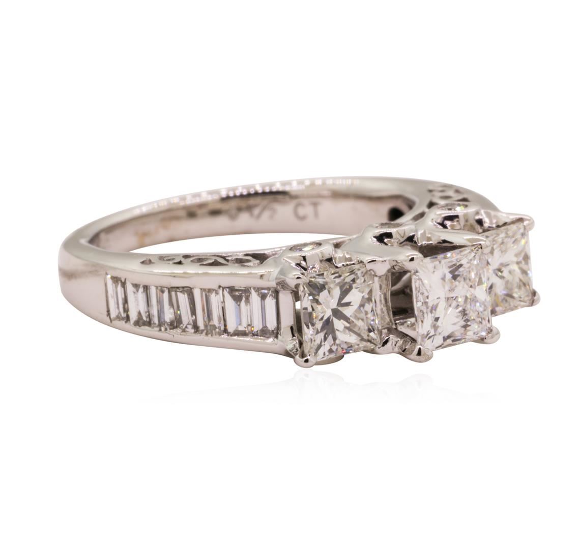One electronically tested 14KT white gold lady's cast three stone straight line cathedral ring with a bright polish finish. The featured lady's ring has a shank measuring 2.00 millimeters wide. Identified with markings of '14K'. Condition is new, good workmanship. Containing: Three prong set princess cut diamonds, measuring 4.15 x 3.90 x 2.93mm (depth est.) approximate total weight of 3 Stones = 1.00ct. Graded in the setting. Color H - I Clarity VS-2 to SI-1 Cut Very Good Fourteen channel set baguette cut diamonds, measuring from 2.30 x 1.30 x 1.11mm (depth est.) to 2.50 x 1.50 x 1.28mm (depth est.) approximate total weight of 14 Stones = 0.45ct. Graded in the setting. Color H - I Clarity VS-1 to SI-1 Cut Very Good Six bezel set round brilliant cut diamonds, measuring 1.60 - 1.50 x 0.96mm (depth est.) approximate total weight of 6 Stones = 0.08ct. Graded in the setting. Color H - I Clarity SI-1 to SI-2 Cut Good. Total Weight of Diamonds 1.53ct.. Total Weight of Ring 4.60gm GAS Appraised at $4505.00. GAS Appraised at $4,505.00.