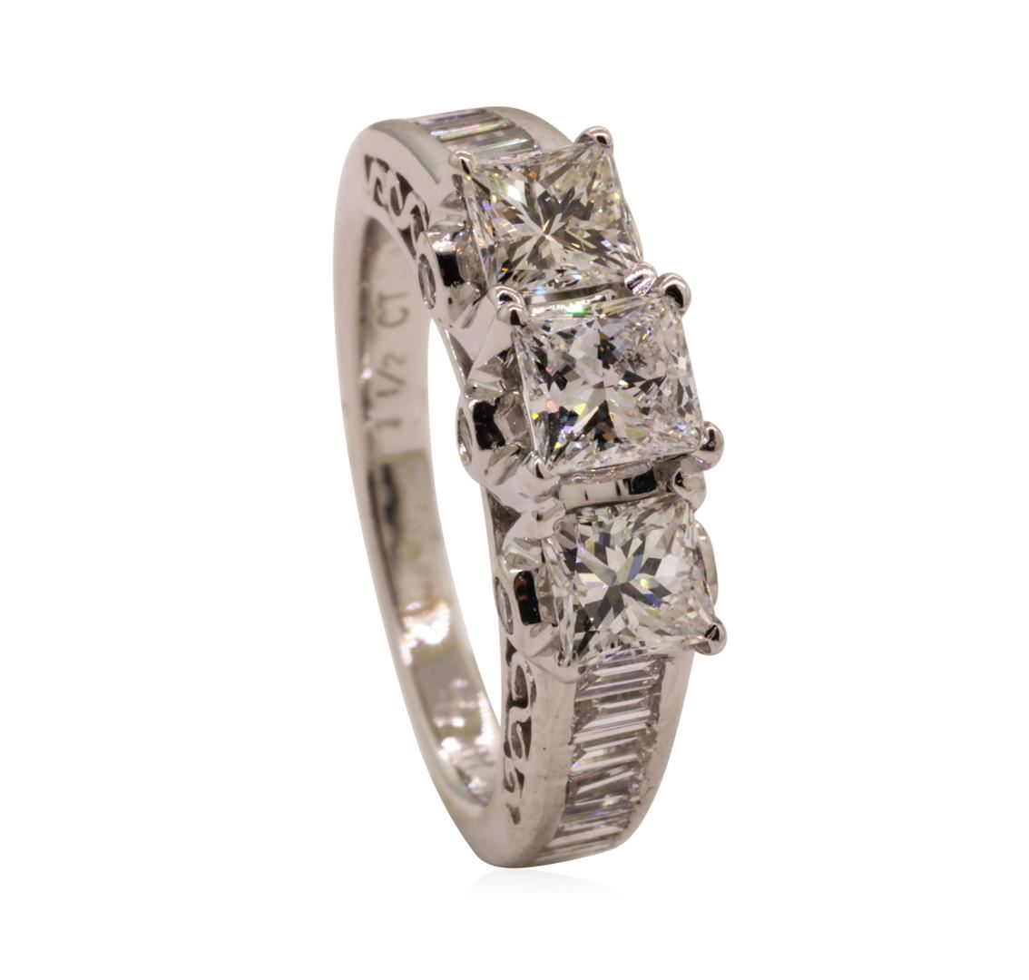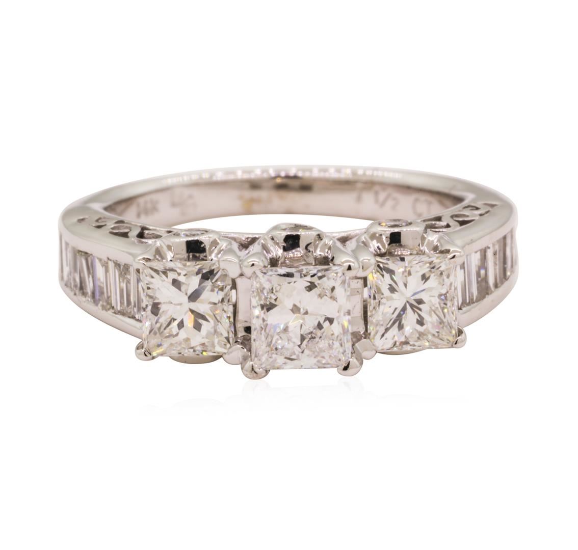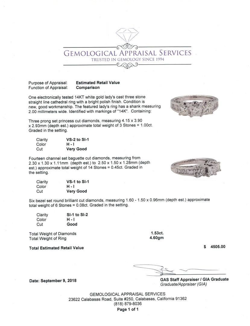 One electronically tested 14KT white gold lady's cast three stone straight line cathedral ring with a bright polish finish. The featured lady's ring has a shank measuring 2.00 millimeters wide. Identified with markings of '14K'. Condition is new, good workmanship. Containing: Three prong set princess cut diamonds, measuring 4.15 x 3.90 x 2.93mm (depth est.) approximate total weight of 3 Stones = 1.00ct. Graded in the setting. Color H - I Clarity VS-2 to SI-1 Cut Very Good Fourteen channel set baguette cut diamonds, measuring from 2.30 x 1.30 x 1.11mm (depth est.) to 2.50 x 1.50 x 1.28mm (depth est.) approximate total weight of 14 Stones = 0.45ct. Graded in the setting. Color H - I Clarity VS-1 to SI-1 Cut Very Good Six bezel set round brilliant cut diamonds, measuring 1.60 - 1.50 x 0.96mm (depth est.) approximate total weight of 6 Stones = 0.08ct. Graded in the setting. Color H - I Clarity SI-1 to SI-2 Cut Good. Total Weight of Diamonds 1.53ct.. Total Weight of Ring 4.60gm GAS Appraised at $4505.00. GAS Appraised at $4,505.00.