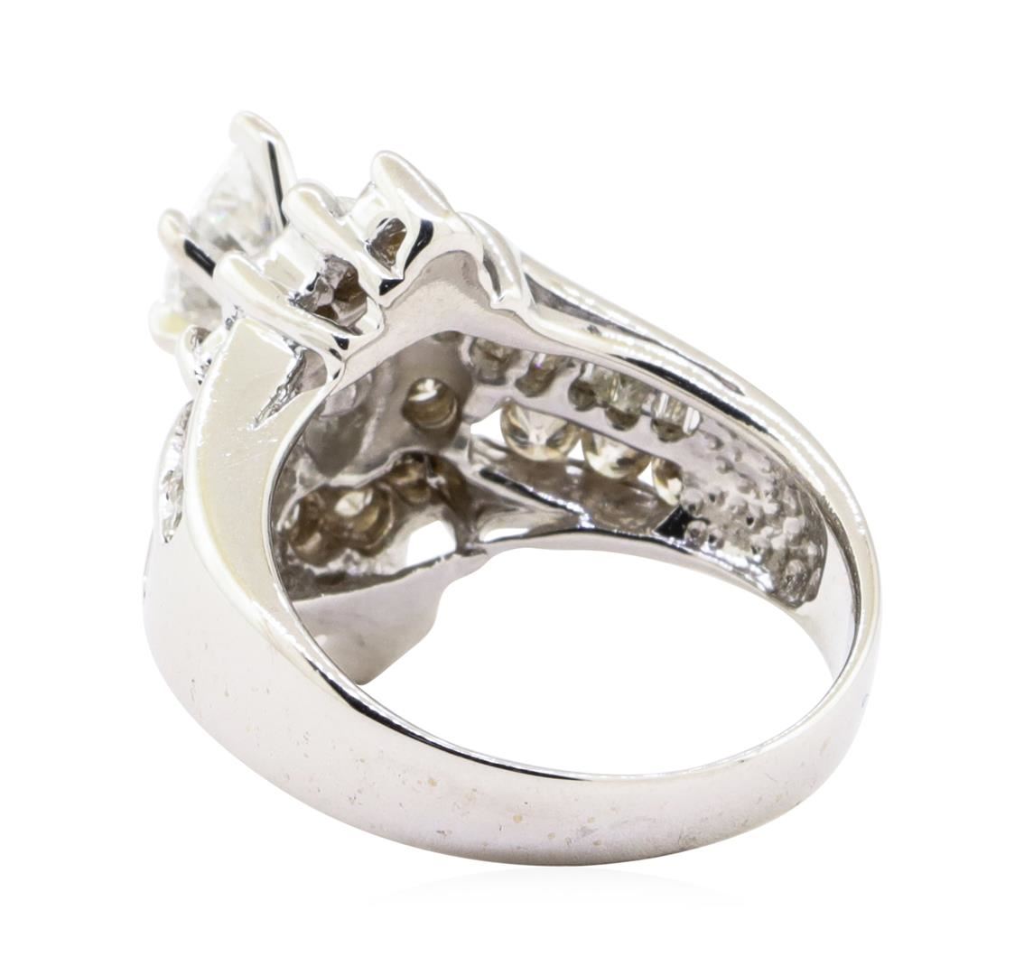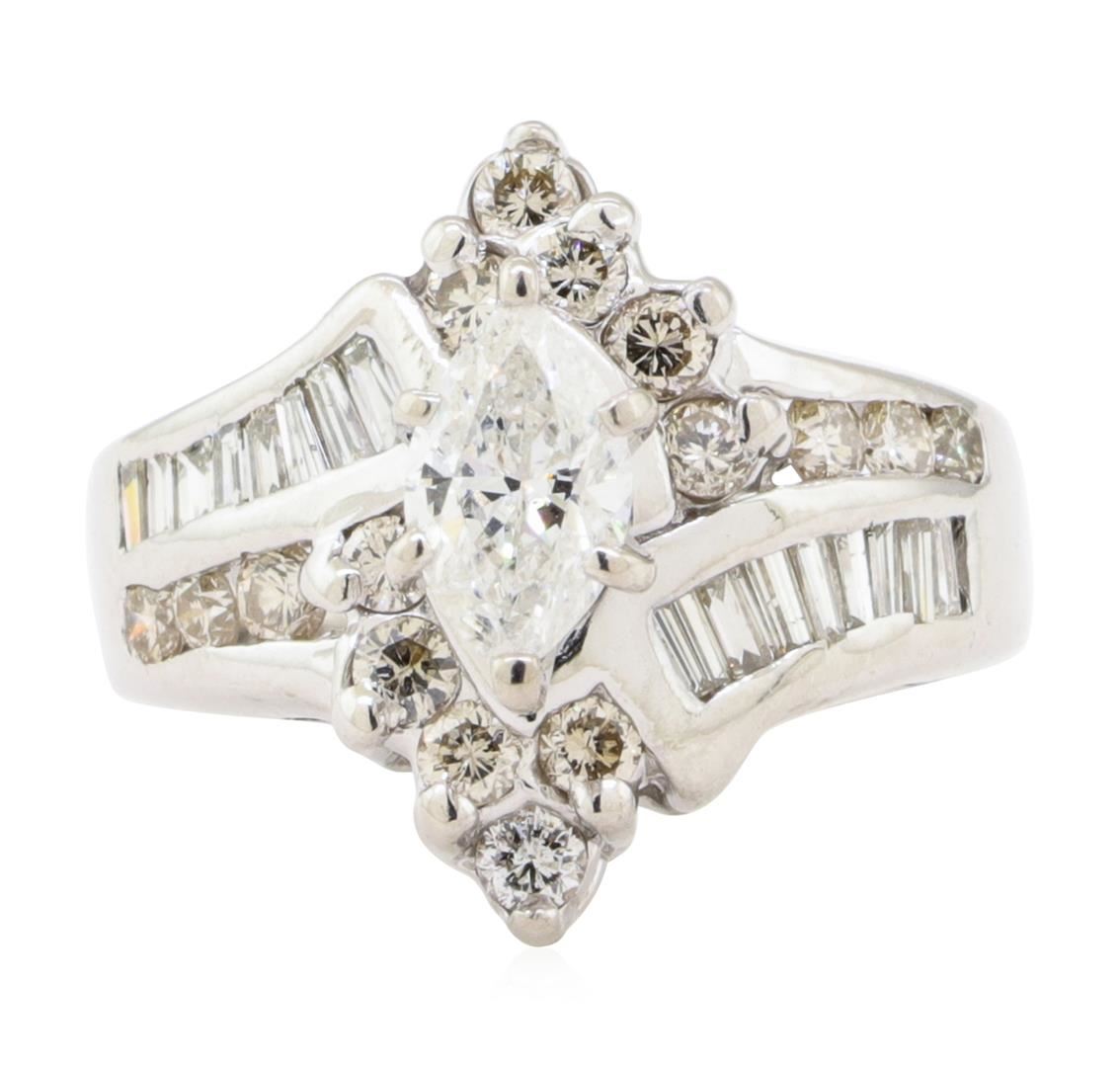 One electronically tested 14KT white gold lady's combination cast & assembled fashion ring with a bypass motif with a bright polish finish. The featured lady's ring has a shank measuring 2.84 millimeters wide. Identified with markings of '14K'. Condition is Good. Containing: One prong set marquise shaped cut diamond, measuring 7.70 x 4.40 x 2.77mm (depth est.) approximate weight of 0.55ct. Graded in the setting. Color H - I Clarity SI-2 Cut Good Sixteen channel set baguette cut diamonds, measuring from 1.90 x 1.00 x 0.85mm (depth est.) to 2.40 x 1.40 x 1.19mm (depth est.) approximate total weight of 16 Stones = 0.40ct. Graded in the setting. Color H - I Clarity SI-1 to SI-2 Cut Good Sixteen prong set round brilliant cut diamonds, measuring 2.20 - 1.80 x 1.20mm (depth est.) approximate total weight of 16 Stones = 0.50ct. Graded in the setting. Color I - K Clarity SI-1 to SI-2 Cut Good. Total Weight of Diamonds 1.45ct.. Total Weight of Ring 5.80gm GAS Appraised at $4795.00. GAS Appraised.